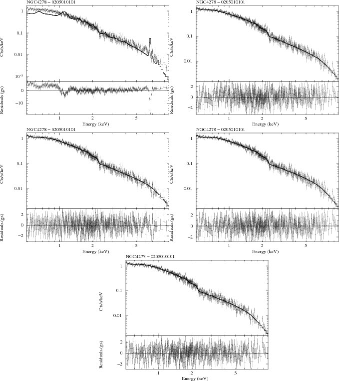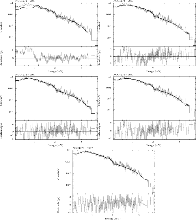 Figure E.19: Spectral fits of NGC4278. (Top-left): Thermal model (MEKAL), (Top-right): Power-law model, (Center-left): Power-law plus thermal model, (Center-right): Two power-law model, (Bottom): Two power-law plus thermal model. |