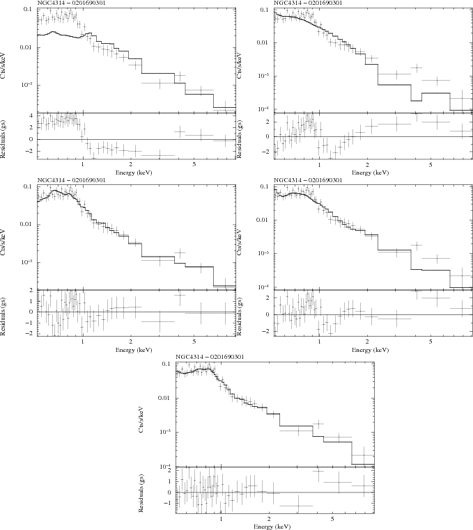 Figure E.20: Spectral fits of NGC4314. (Top-left): Thermal model (MEKAL), (Top-right): Power-law model, (Center-left): Power-law plus thermal model, (Center-right): Two power-law model, (Bottom): Two power-law plus thermal model. |