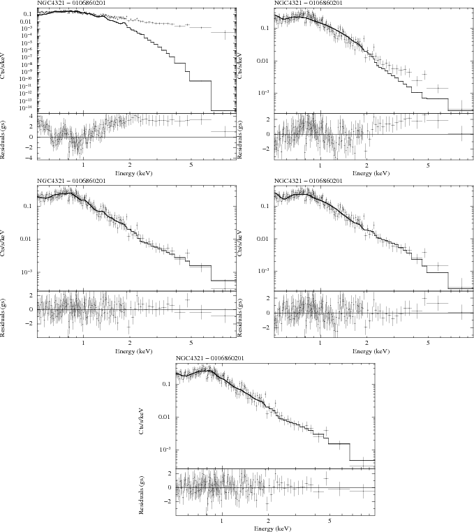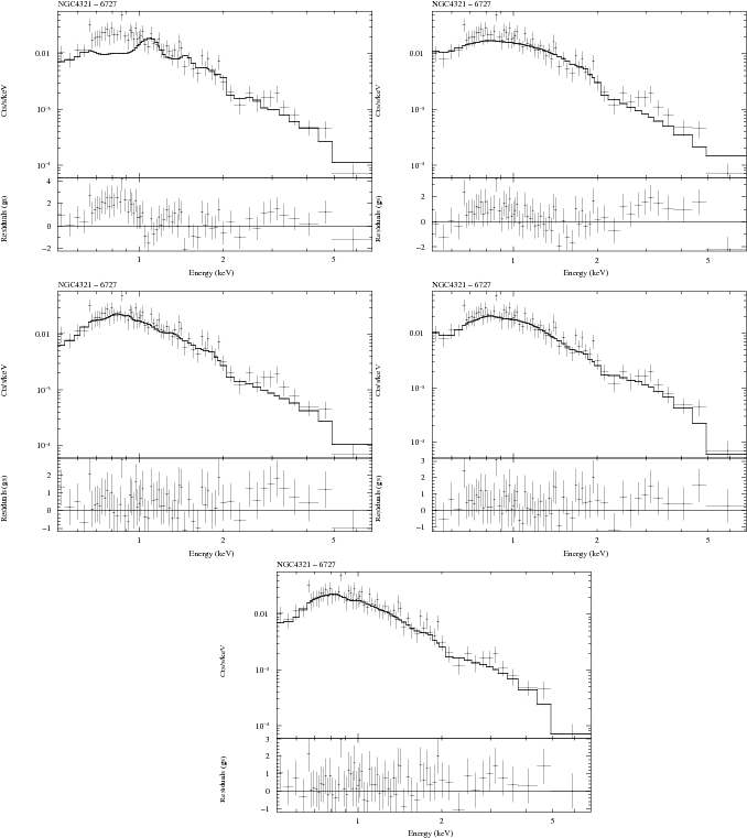 Figure E.21: Spectral fits of NGC4321. (Top-left): Thermal model (MEKAL), (Top-right): Power-law model, (Center-left): Power-law plus thermal model, (Center-right): Two power-law model, (Bottom): Two power-law plus thermal model. |
