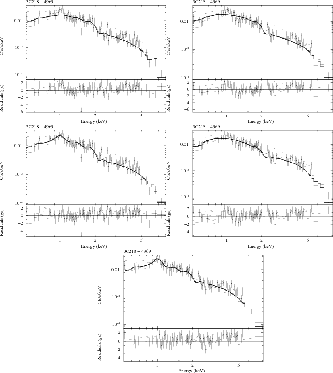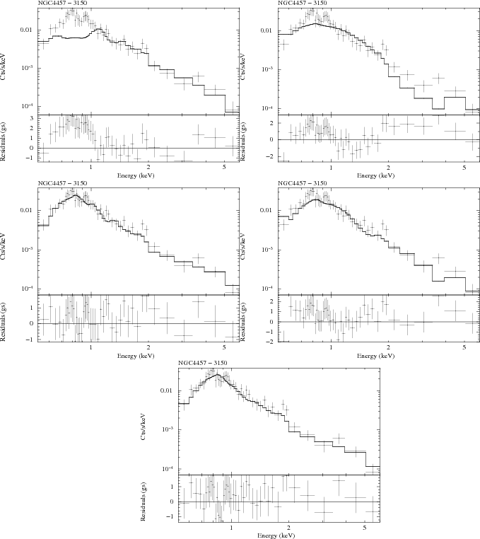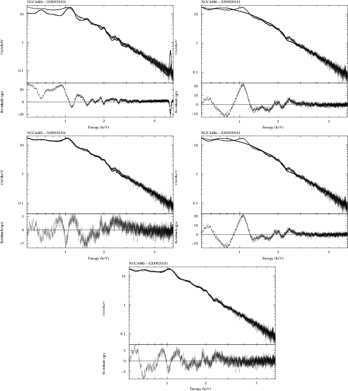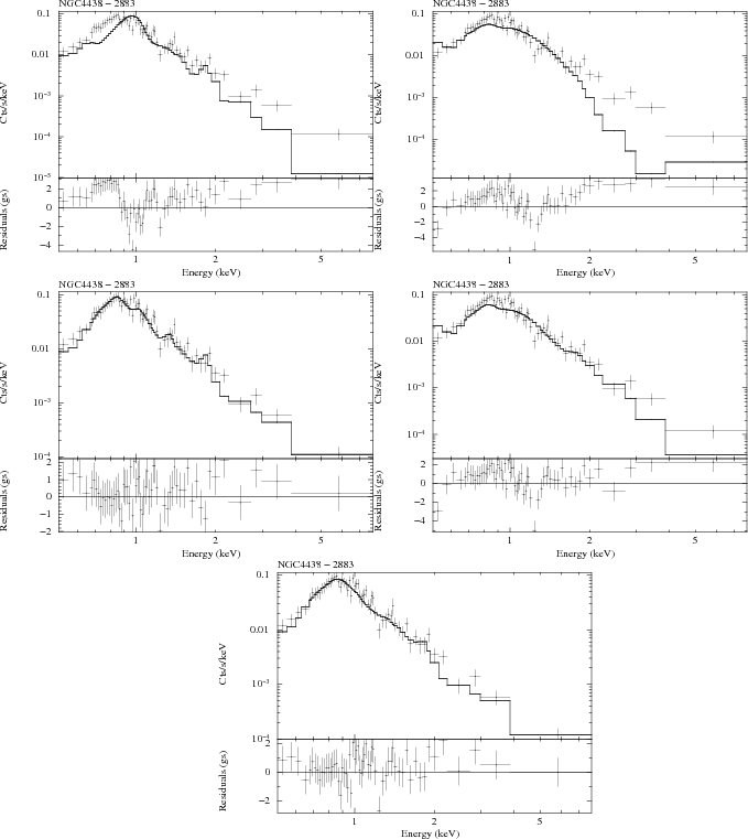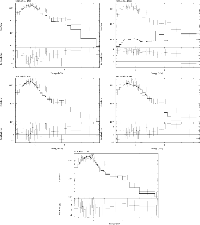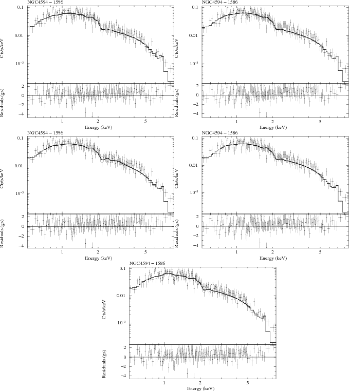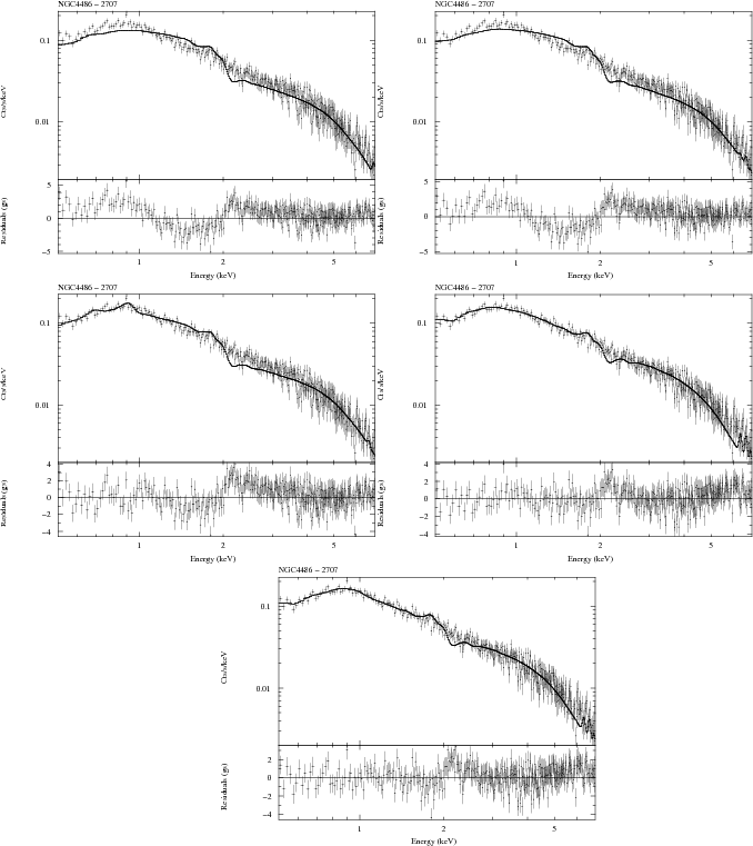 Figure E.22: Spectral fits of NGC4486. (Top-left): Thermal model (MEKAL), (Top-right): Power-law model, (Center-left): Power-law plus thermal model, (Center-right): Two power-law model, (Bottom): Two power-law plus thermal model. |