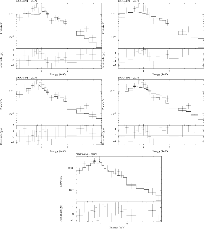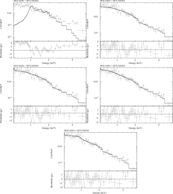 Figure E.23: Spectral fits of NGC4494. (Top-left): Thermal model (MEKAL), (Top-right): Power-law model, (Center-left): Power-law plus thermal model, (Center-right): Two power-law model, (Bottom): Two power-law plus thermal model. |