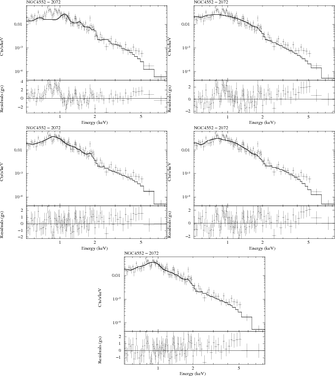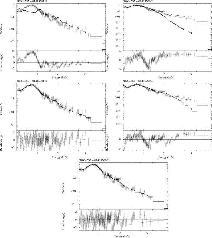 Figure E.24: Spectral fits of NGC4552. (Top-left): Thermal model (MEKAL), (Top-right): Power-law model, (Center-left): Power-law plus thermal model, (Center-right): Two power-law model, (Bottom): Two power-law plus thermal model. |