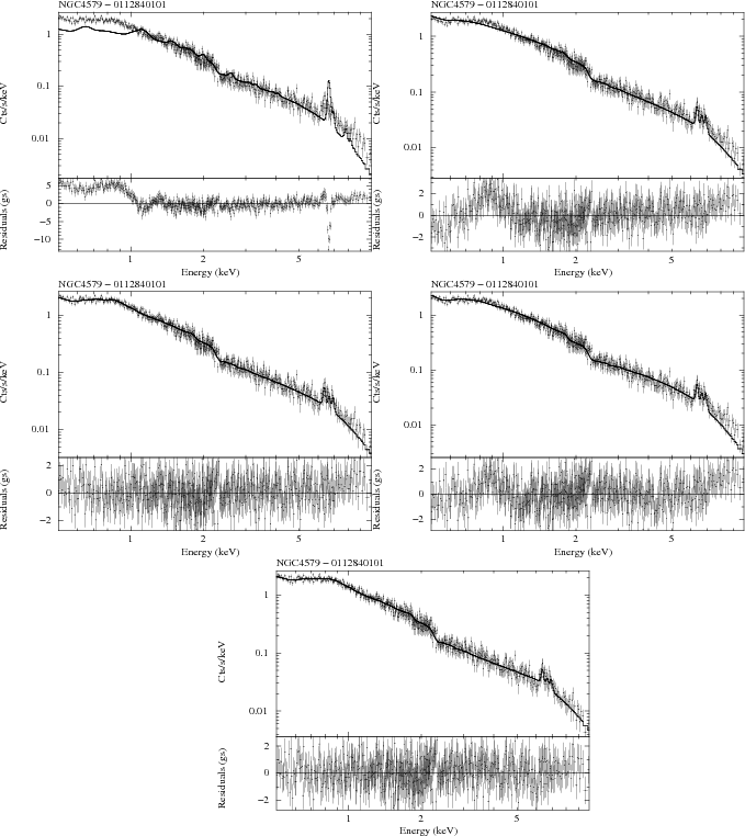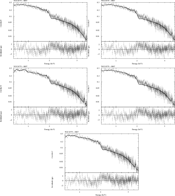 Figure E.25: Spectral fits of NGC4579. (Top-left): Thermal model (MEKAL), (Top-right): Power-law model, (Center-left): Power-law plus thermal model, (Center-right): Two power-law model, (Bottom): Two power-law plus thermal model. |