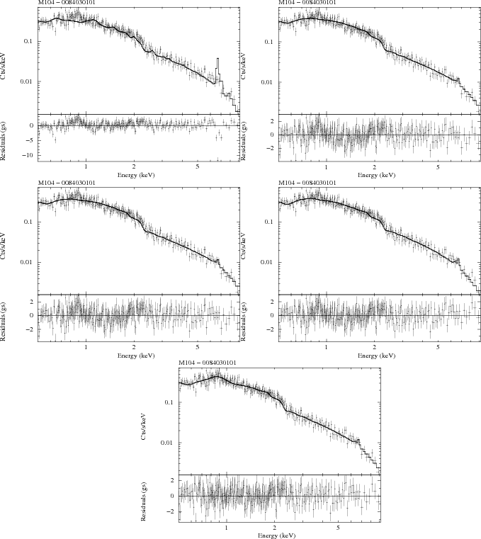 Figure E.26: Spectral fits of NGC4594. (Top-left): Thermal model (MEKAL), (Top-right): Power-law model, (Center-left): Power-law plus thermal model, (Center-right): Two power-law model, (Bottom): Two power-law plus thermal model. |