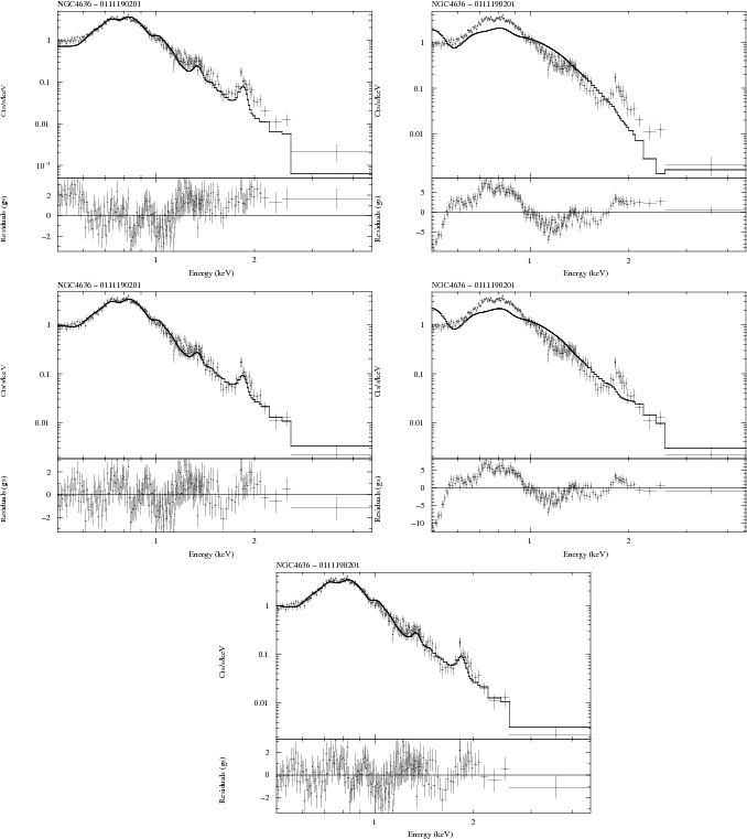 Figure E.27: Spectral fits of NGC4636. (Top-left): Thermal model (MEKAL), (Top-right): Power-law model, (Center-left): Power-law plus thermal model, (Center-right): Two power-law model, (Bottom): Two power-law plus thermal model. |