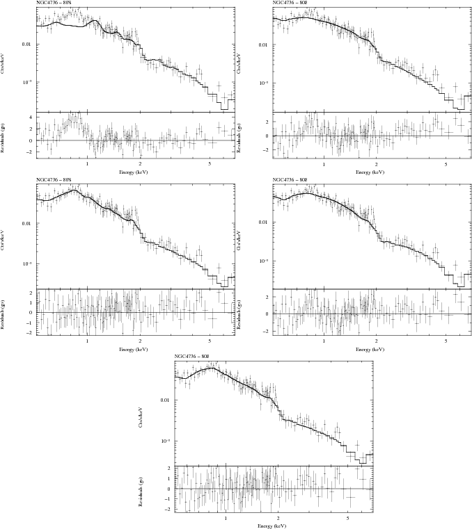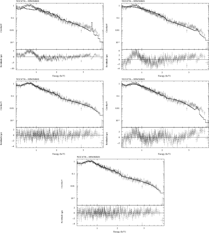 Figure E.28: Spectral fits of NGC4736. (Top-left): Thermal model (MEKAL), (Top-right): Power-law model, (Center-left): Power-law plus thermal model, (Center-right): Two power-law model, (Bottom): Two power-law plus thermal model. |