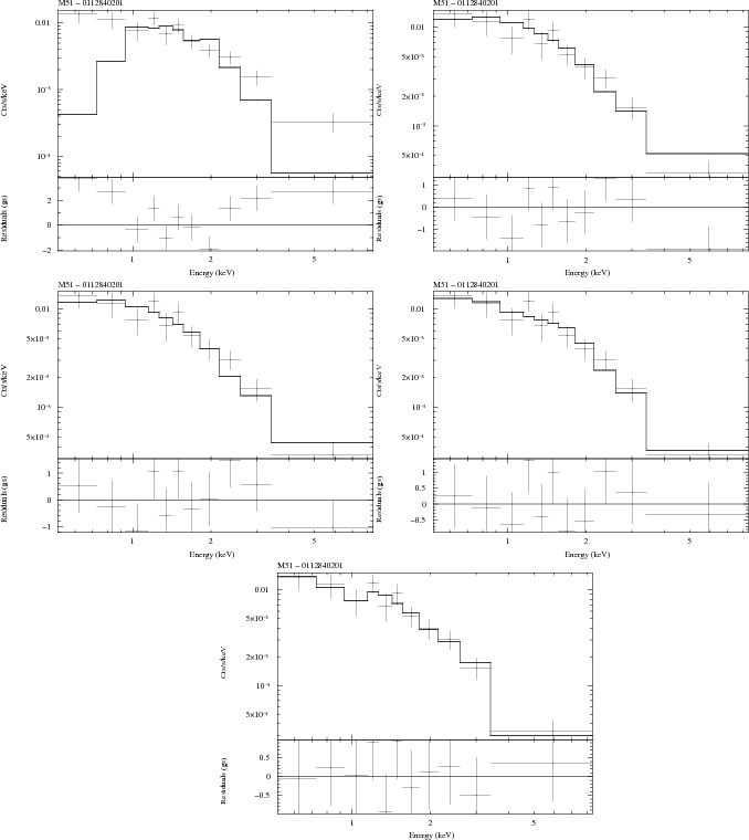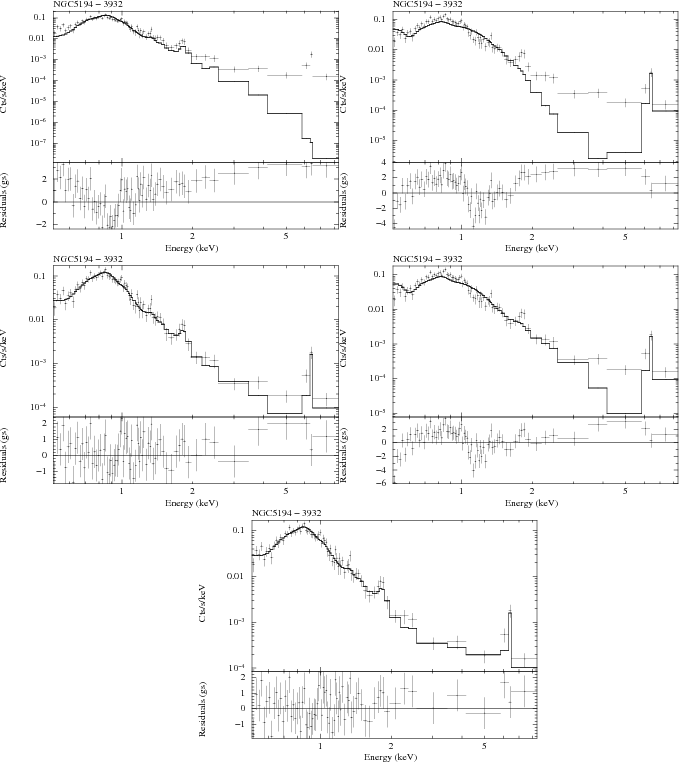 Figure E.30: Spectral fits of NGC5194. (Top-left): Thermal model (MEKAL), (Top-right): Power-law model, (Center-left): Power-law plus thermal model, (Center-right): Two power-law model, (Bottom): Two power-law plus thermal model. |