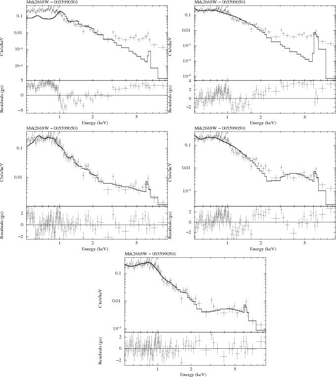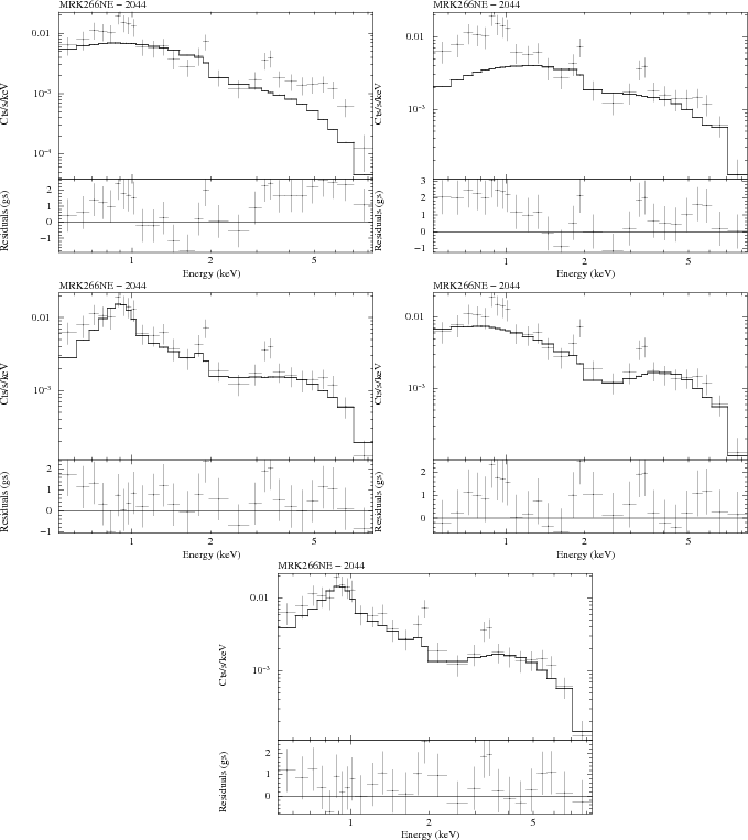 Figure E.31: Spectral fits of Mrk266SW. (Top-left): Thermal model (MEKAL), (Top-right): Power-law model, (Center-left): Power-law plus thermal model, (Center-right): Two power-law model, (Bottom): Two power-law plus thermal model. |