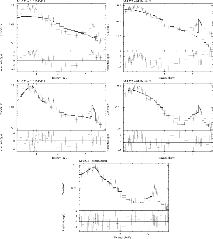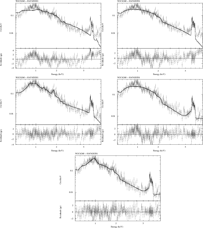 Figure D.40: Spectral fits of NGC6240. (Top-left): Thermal model (MEKAL), (Top-right): Power-law model, (Center-left): Power-law plus thermal model, (Center-right): Two power-law model, (Bottom): Two power-law plus thermal model. |