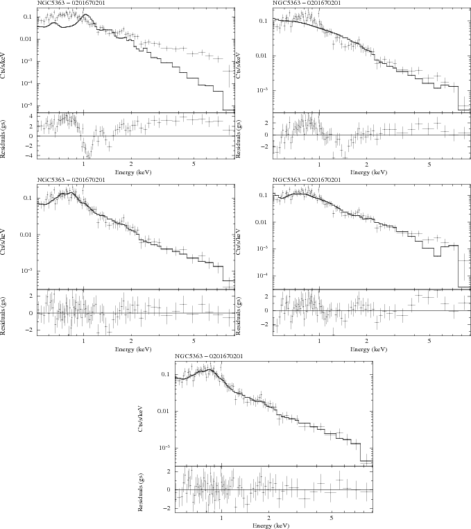 Figure E.34: Spectral fits of NGC5363. (Top-left): Thermal model (MEKAL), (Top-right): Power-law model, (Center-left): Power-law plus thermal model, (Center-right): Two power-law model, (Bottom): Two power-law plus thermal model. |
