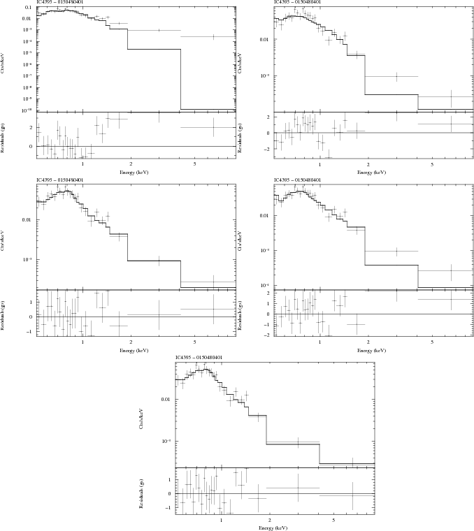 Figure E.35: Spectral fits of IC4395. (Top-left): Thermal model (MEKAL), (Top-right): Power-law model, (Center-left): Power-law plus thermal model, (Center-right): Two power-law model, (Bottom): Two power-law plus thermal model. |