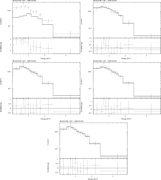 Figure E.36: Spectral fits of IRAS 14348-1447. (Top-left): Thermal model (MEKAL), (Top-right): Power-law model, (Center-left): Power-law plus thermal model, (Center-right): Two power-law model, (Bottom): Two power-law plus thermal model. |