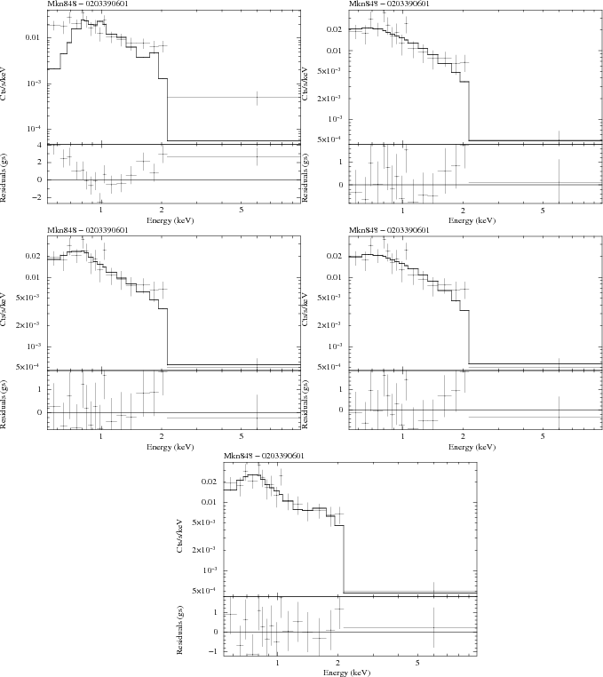 Figure E.39: Spectral fits of Mkn848. (Top-left): Thermal model (MEKAL), (Top-right): Power-law model, (Center-left): Power-law plus thermal model, (Center-right): Two power-law model, (Bottom): Two power-law plus thermal model. |