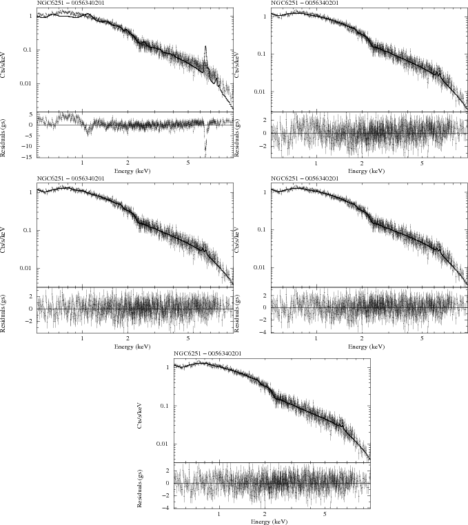 Figure E.40: Spectral fits of NGC6251. (Top-left): Thermal model (MEKAL), (Top-right): Power-law model, (Center-left): Power-law plus thermal model, (Center-right): Two power-law model, (Bottom): Two power-law plus thermal model. |