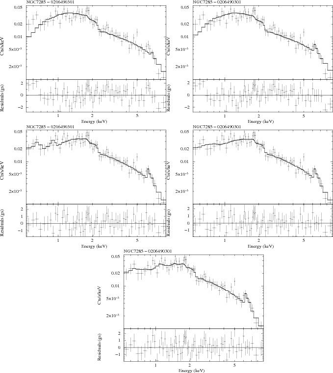 Figure E.44: Spectral fits of NGC7285. (Top-left): Thermal model (MEKAL), (Top-right): Power-law model, (Center-left): Power-law plus thermal model, (Center-right): Two power-law model, (Bottom): Two power-law plus thermal model. |