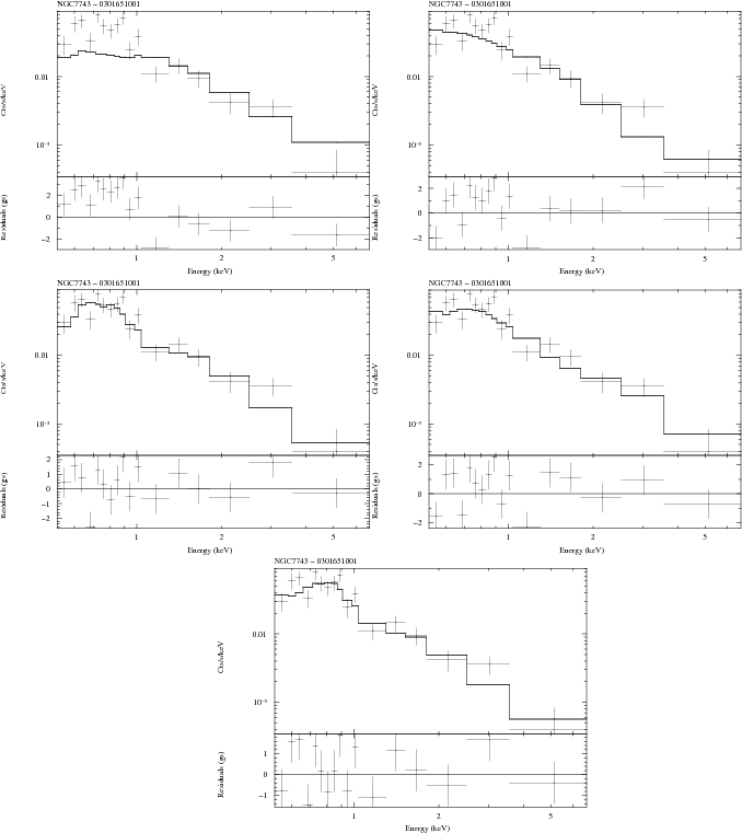 Figure E.47: Spectral fits of NGC7743. (Top-left): Thermal model (MEKAL), (Top-right): Power-law model, (Center-left): Power-law plus thermal model, (Center-right): Two power-law model, (Bottom): Two power-law plus thermal model. |