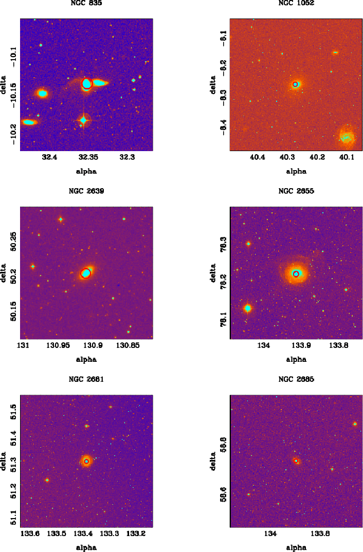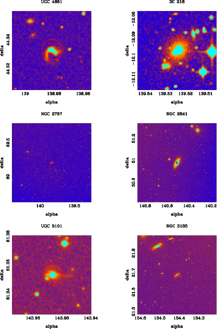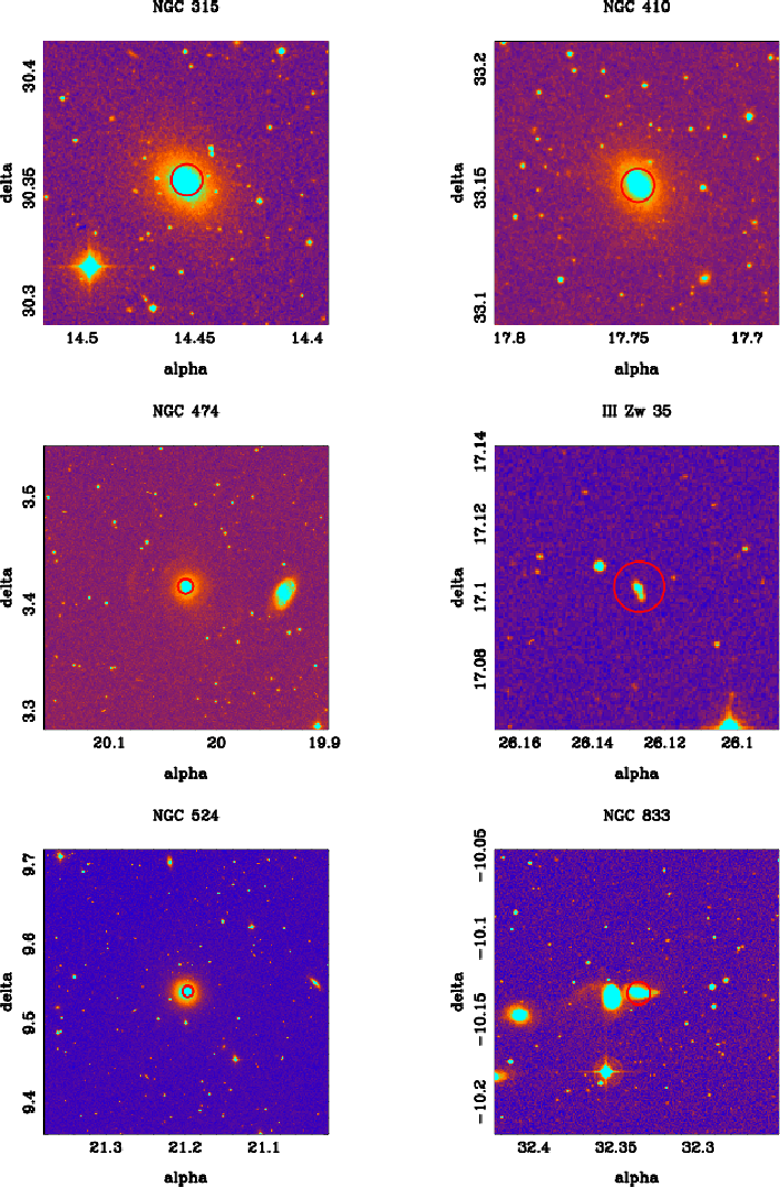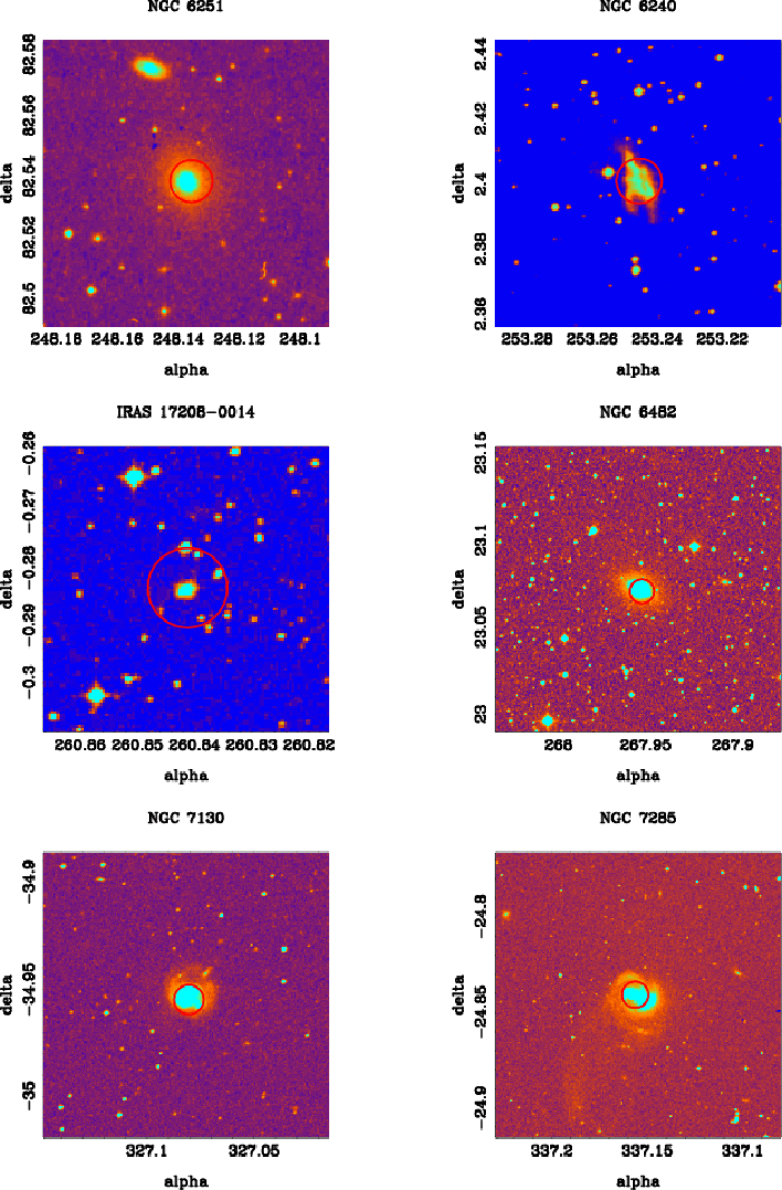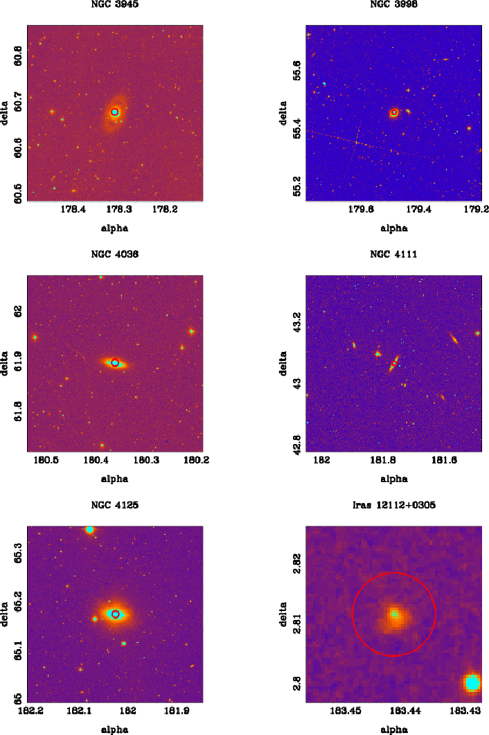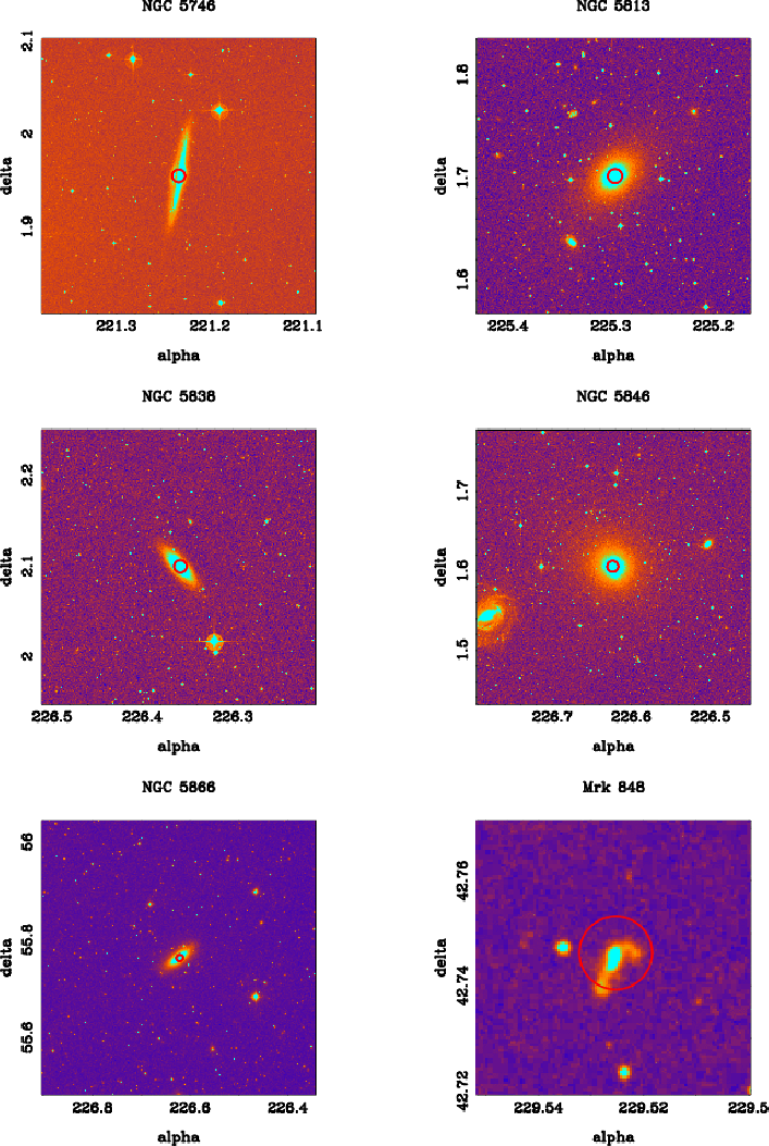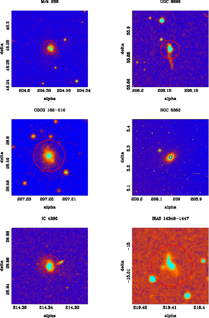 Figure F.1: Images from the Digital Sky Survey showing boxes of 150 kpc on a side, based on distances provided in Table 1. The red circle indicates de 25'' extraction region for XMM-Newton spectra. Galaxies with label numbers from 1 to 6. |