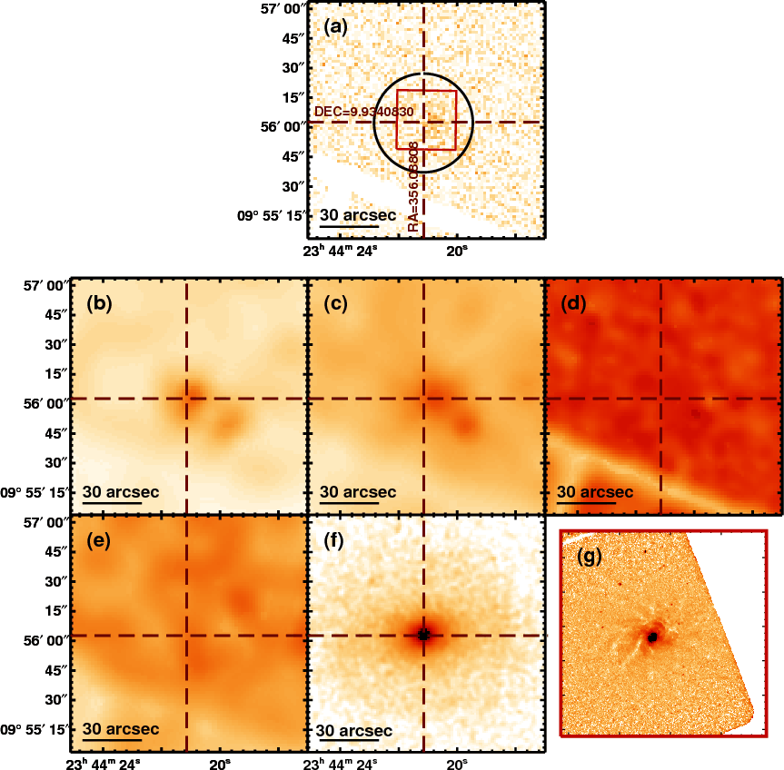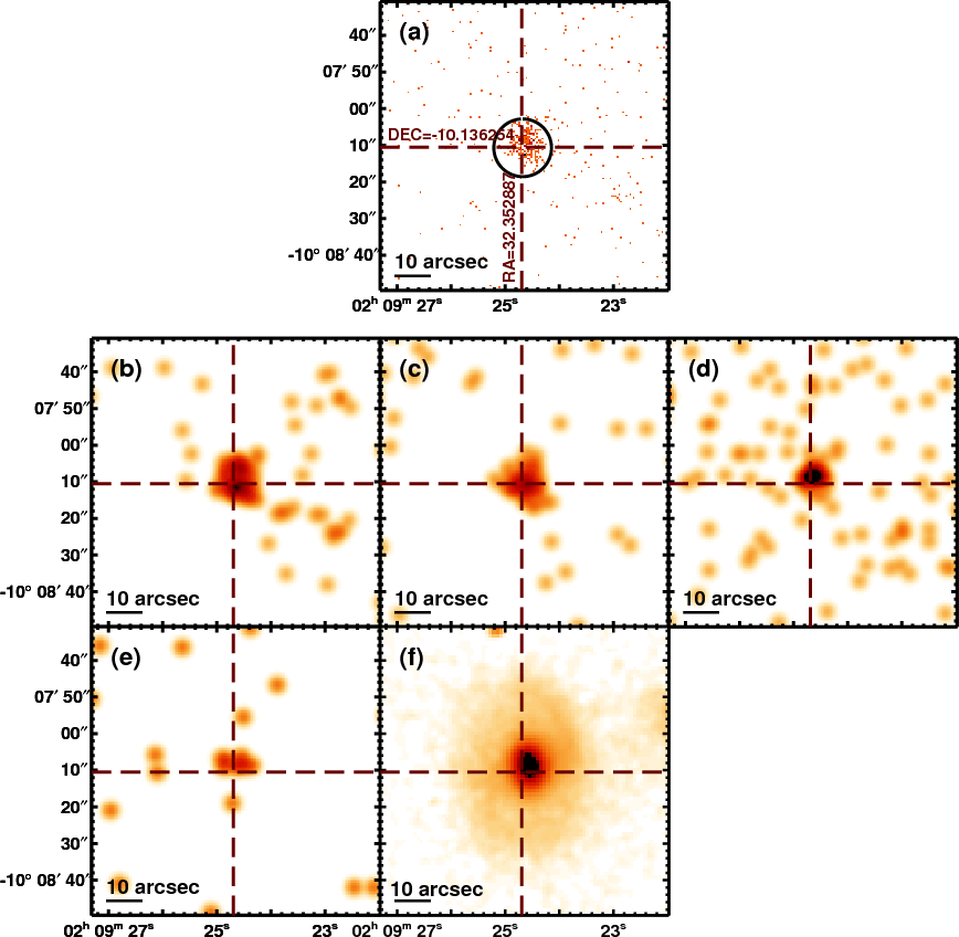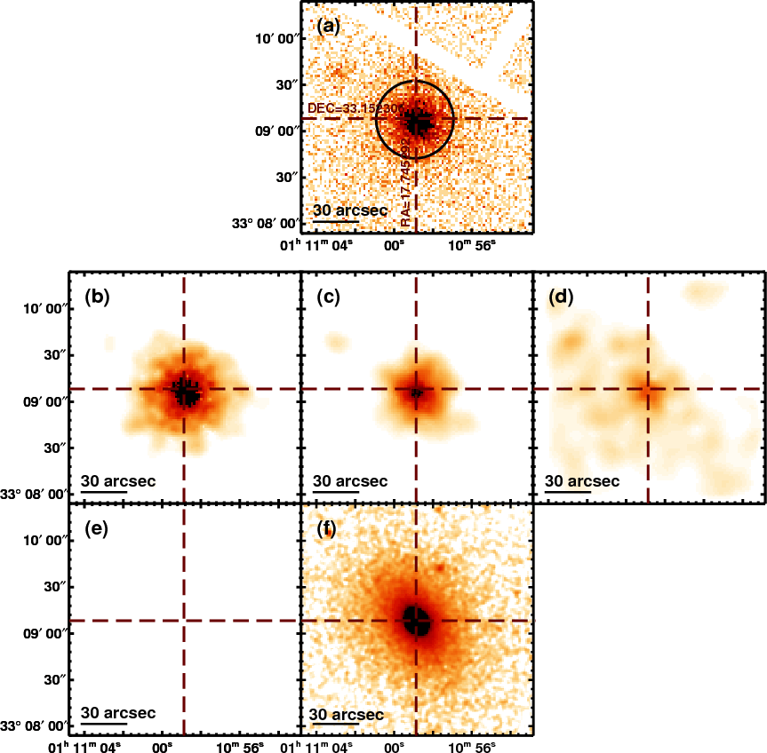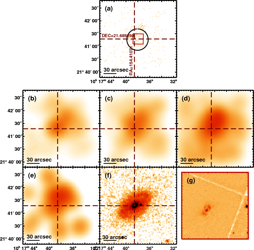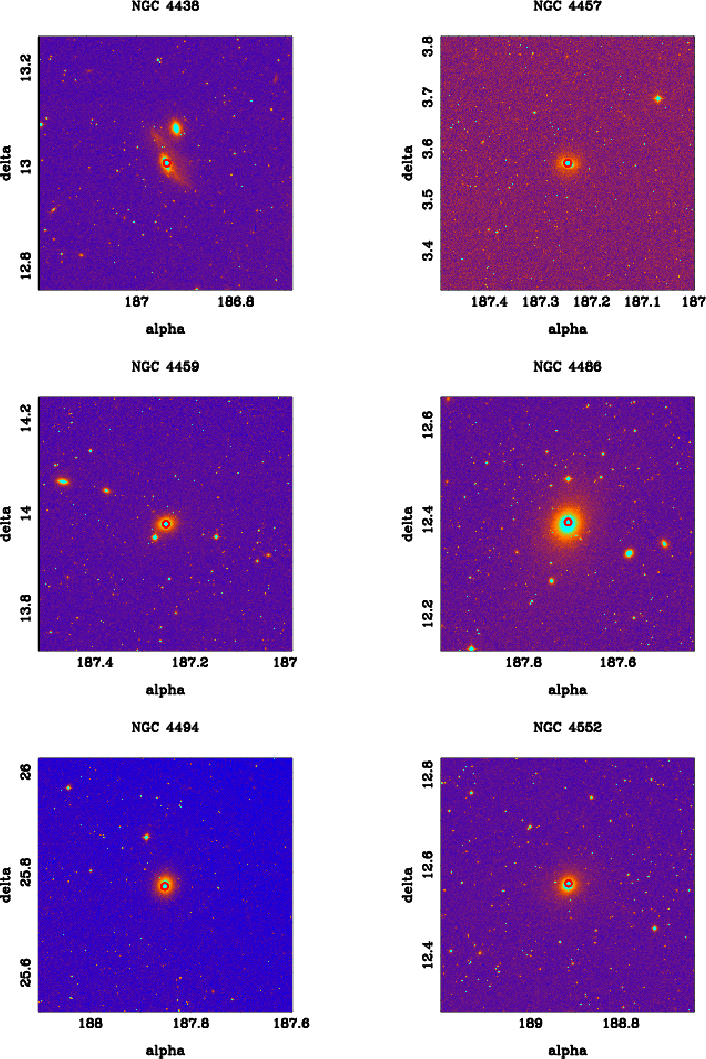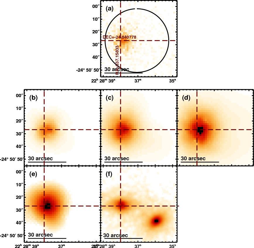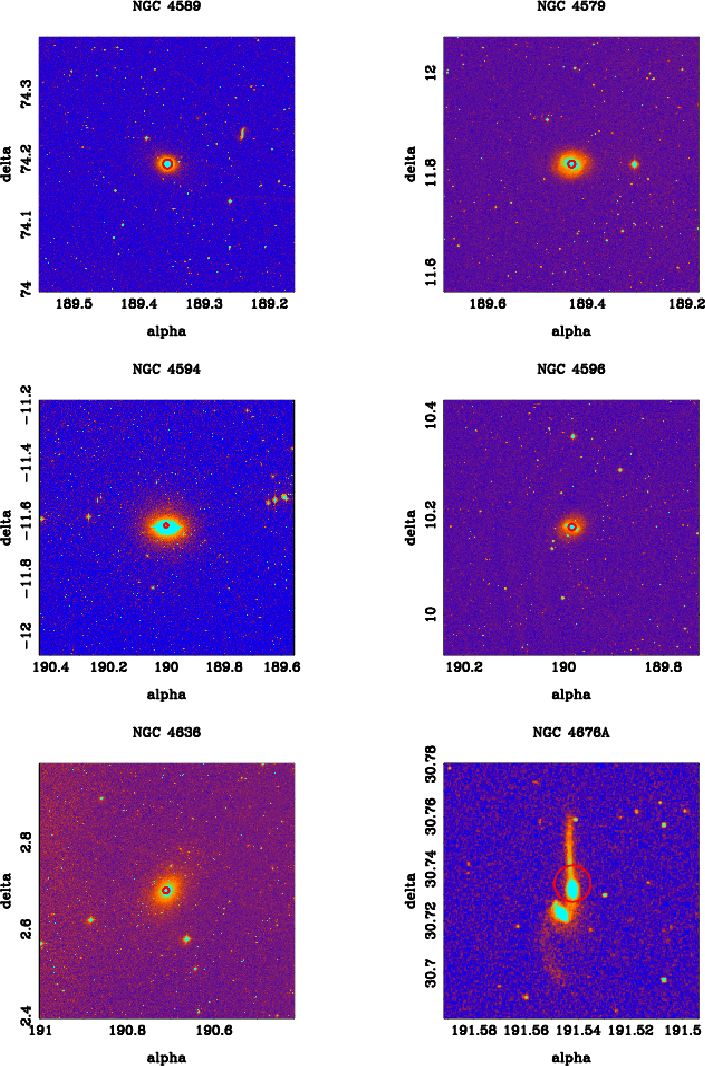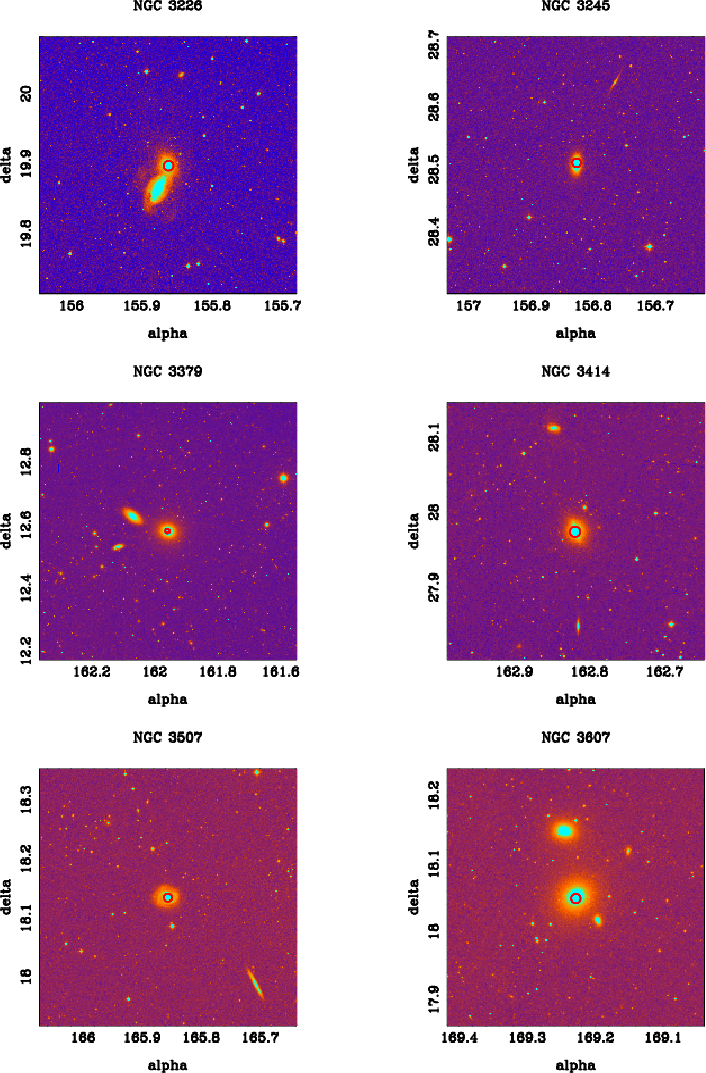 Figure F.1: Images from the Digital Sky Survey showing boxes of 150 kpc on a side, based on distances provided in Table 1. The red circle indicates de 25'' extraction region for XMM-Newton spectra. Galaxies with label numbers from 1 to 6. |