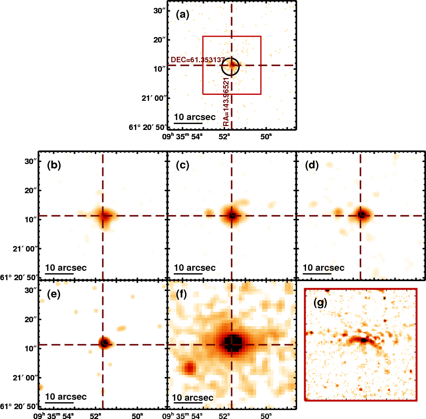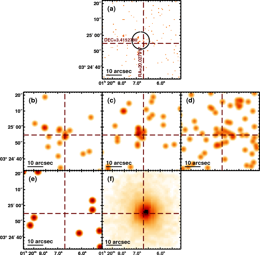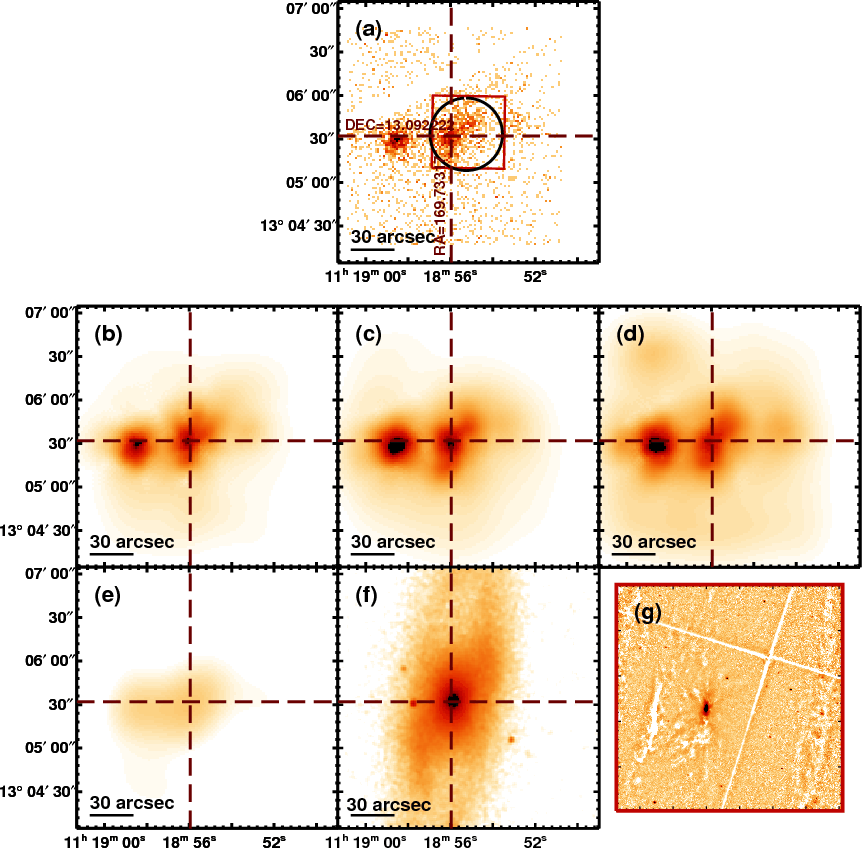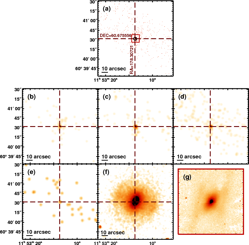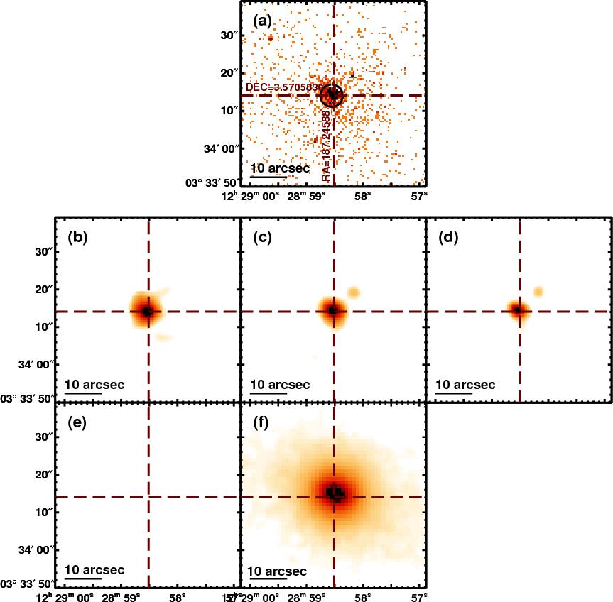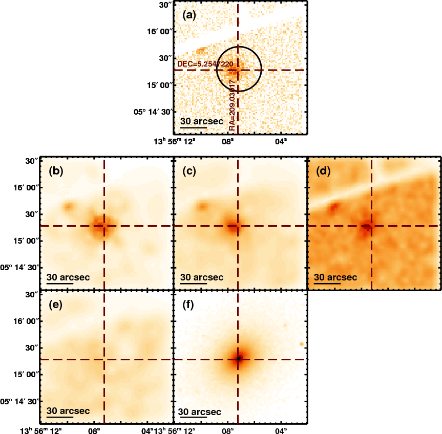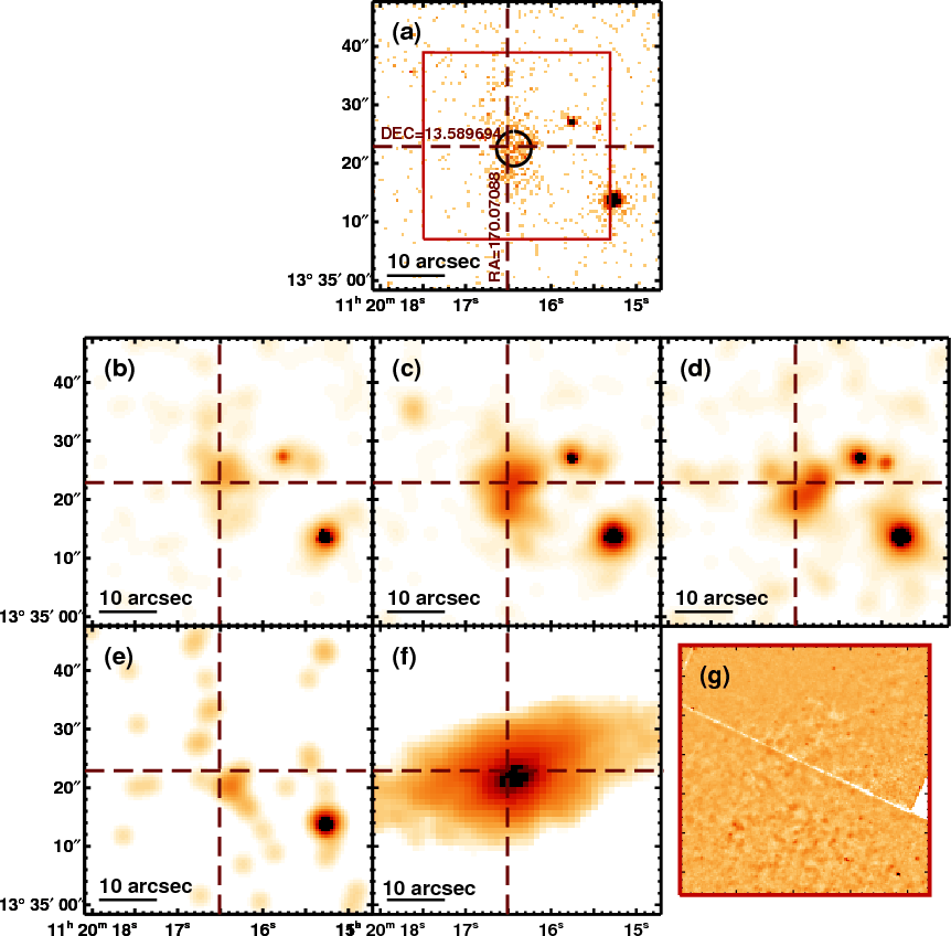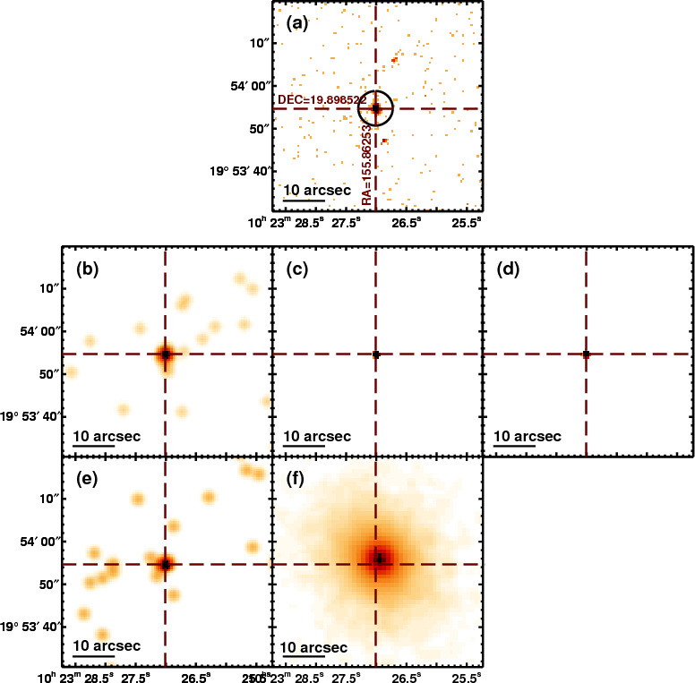 Figure F.1: Images from the Digital Sky Survey showing boxes of 150 kpc on a side, based on distances provided in Table 1. The red circle indicates de 25'' extraction region for XMM-Newton spectra. Galaxies with label numbers from 1 to 6. |