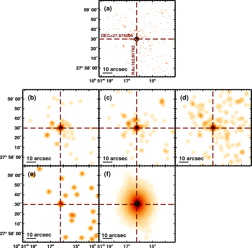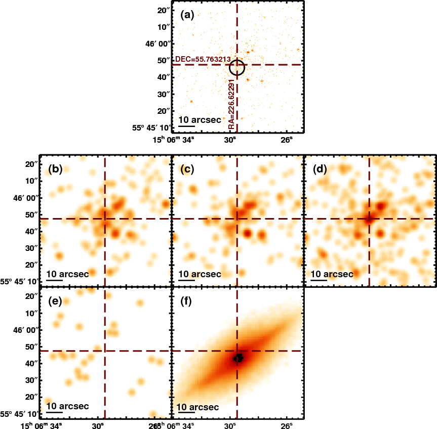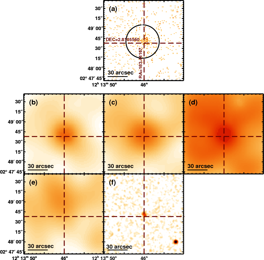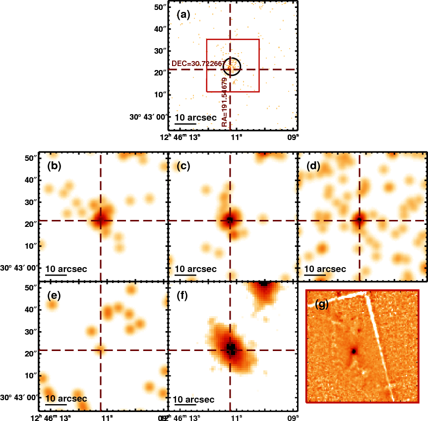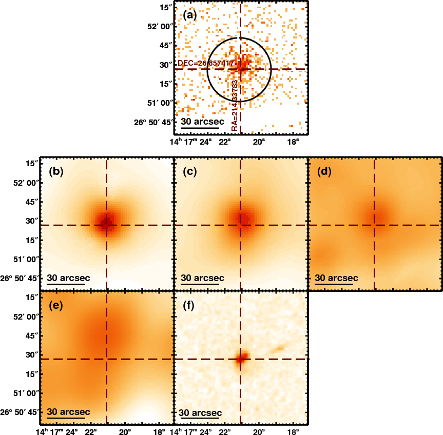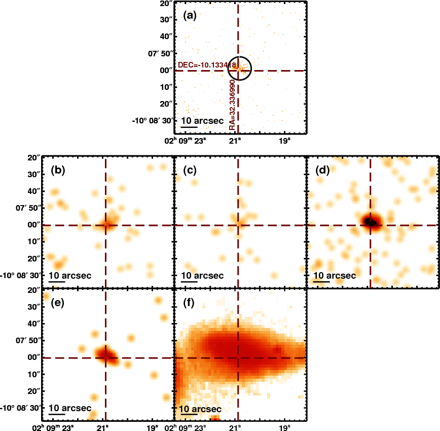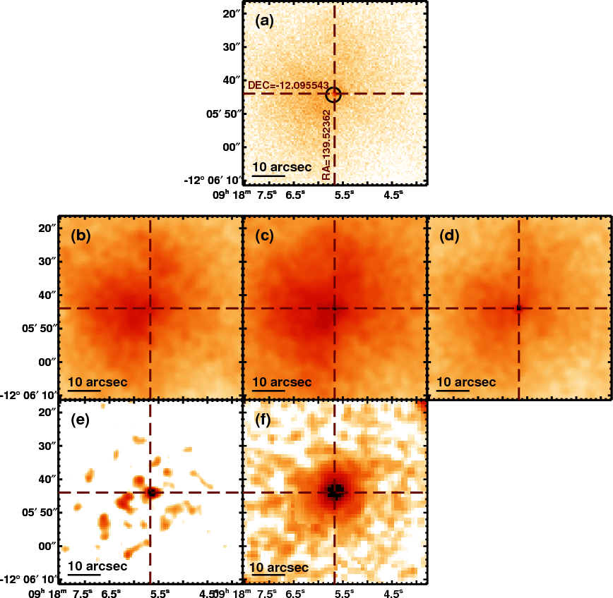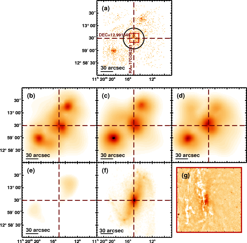 Figure F.1: Images from the Digital Sky Survey showing boxes of 150 kpc on a side, based on distances provided in Table 1. The red circle indicates de 25'' extraction region for XMM-Newton spectra. Galaxies with label numbers from 1 to 6. |