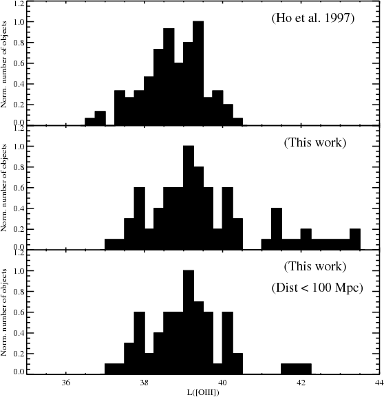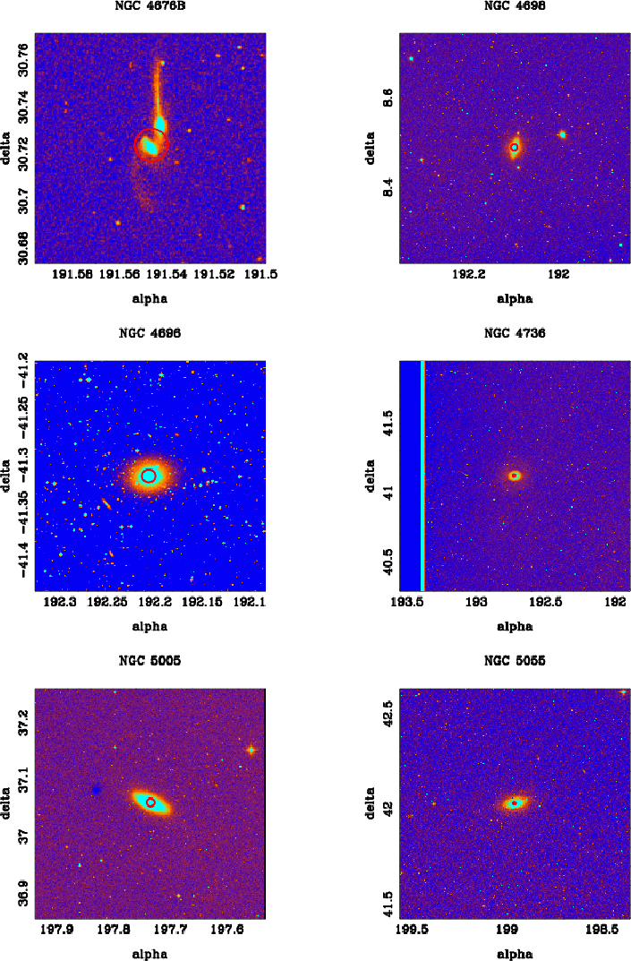 LINER identifications were revised with standard diagnostic diagrams (Baldwin et al. 1981; Veilleux & Osterbrock 1987). We obtained emission line fluxes for all but 18 objects from the literature (Ho et al. 2001; Veilleux et al. 1995; Moustakas & Kennicutt 2006; Wu et al. 1998). The 18 objects were excluded to ensure a sample of bonafide LINERs. In the same vein, another four objects that lack [OIII] measured fluxes (NGC 3189, NGC 4414, NGC 5350, and NGC 6503) were excluded. NGC 4013 was also rejected because its [OIII] measurement is affected by a 100% error. Fifty-one out of the 116 objects had already been classified as LINERs in our previous work (GM+06). However, later reanalysis showed that the classification given by GM+06 for NGC 4395 and NGC 5194 was not correct. Thus, they are most likely Seyfert galaxies. This yields 49 LINERs in common with GM+06.