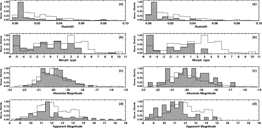 Figure 1: (Left): total sample of LINERs in MCL (empty histogram) versus X-ray sample (dashed histogram), normalised to the peak. (Right): X-ray sample (empty histogram) versus the sample reported by GM+06, normalised to the peak. a) Redshift, b) morphological types (from the RC3 catalogue: t<0 are for ellipticals, t=0 for S0, t=1 for Sa, t=3 for Sb, t=5 for Sc, t=7 for Sd, and t>8 for irregulars), c) absolute magnitudes, and d) apparent magnitudes distributions. |