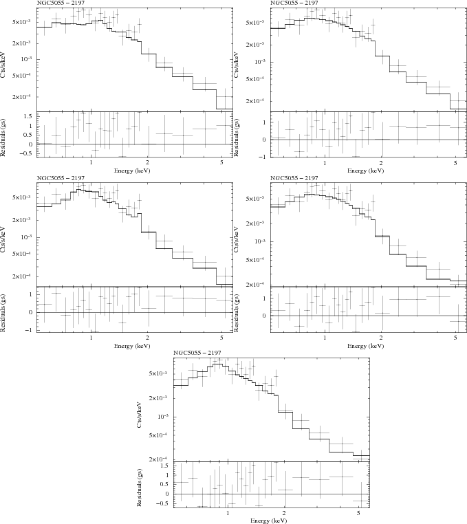 Figure E.29: Spectral fits of NGC5005. (Top-left): Thermal model (MEKAL), (Top-right): Power-law model, (Center-left): Power-law plus thermal model, (Center-right): Two power-law model, (Bottom): Two power-law plus thermal model. |