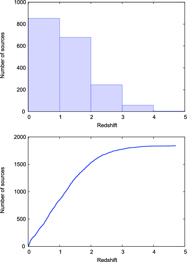 Table 3: Statistics of the model and real distributions of the radio sources over four redshift intervals.