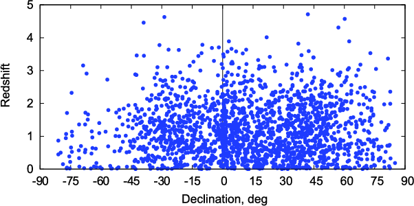 Once the separation in different zones of redshift is applicable, we also considered the correlation between observables in four zones for the model and real distributions (Figs. 5 and 6, respectively). The model distribution without a decrease in the number of sources around the South Celestial Pole produces almost equal maximum correlation parameters for all four redshift zones (from 0.15 to 0.19). A deficit of the real radio sources around the South Celestial Pole is more crucial. Figure 6 demonstrates the impact of the North-South asymmetry on the real distribution of radio sources. For the zone of redshift between 3 and 4 the maximum correlation reaches 0.51.