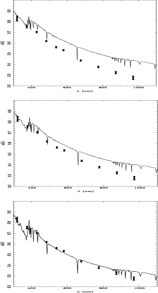 From the above comparisons, we can conclude that the current stellar atmosphere models are unable to predict the measured LDCs for HD 209458. The unique case that seems to fit the observations marginally is the linear approach (Sect. 3.1) when we adopt the FCM. However, the limb-darkening is clearly a non-linear phenomenon and this law is then inadequate. For FCM, this method, which preserves the flux integrally, is inadequate because it does not describe well the specific intensities. As is already known, for a given atmosphere model, the FCM provides smaller linear LDCs than those computed by adopting the LSM. This is probably the reason why the linear theoretical LDCs computed by using the FCM seem to reproduced more successfully the empirical values (third panel, Fig. 1). When we apply the FCM to the quadratic law, the corresponding LDCs also do not match the observations (panels 3 and 4, Fig. 3). In this way, the exact flux conservation condition seems to be disconnected from the goodness of the fitting.