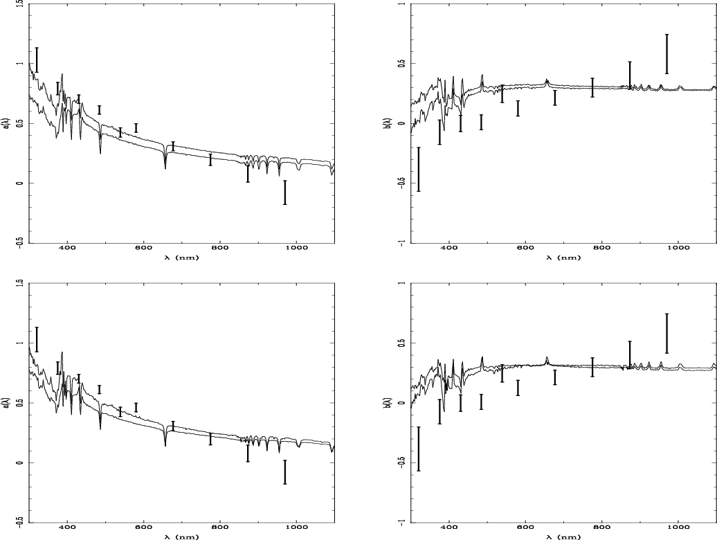 but even by increasing this to 8 km s-1, the empirical LDCs remain smaller than the resulting theoretical ones (third panel of Fig. 2). Finally, in the fourth panel of Fig. 2, we show the calculations considering the spherical PHOENIX models (Claret & Hauschildt 2003). There is no large difference from the panels 1 and 2 of Fig. 1,
