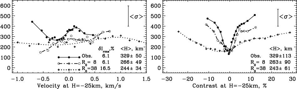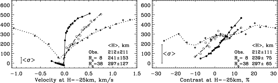 - The precise values of the heights of velocity and contrast sign reversal obtained from observations are sensitive to the spatial resolution within their standard deviation error bars.