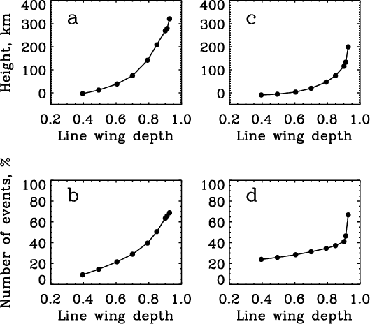 Figure 13: a) Average height of the contrast sign reversal as a function of Ba II line depth. b) Fraction of the events of the contrast sign reversal with height as a function of the Ba II line depth. c) and d) same for the velocity sign reversal. |