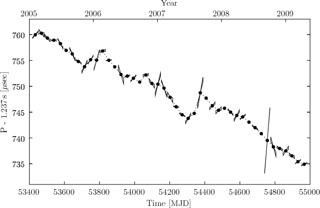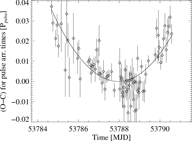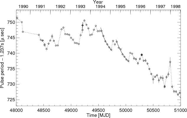 variation of the pulsation period (i.e. spin rate of the neutron star).