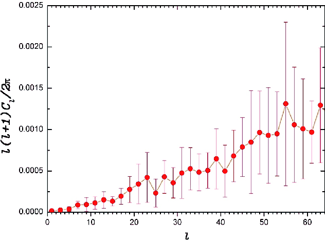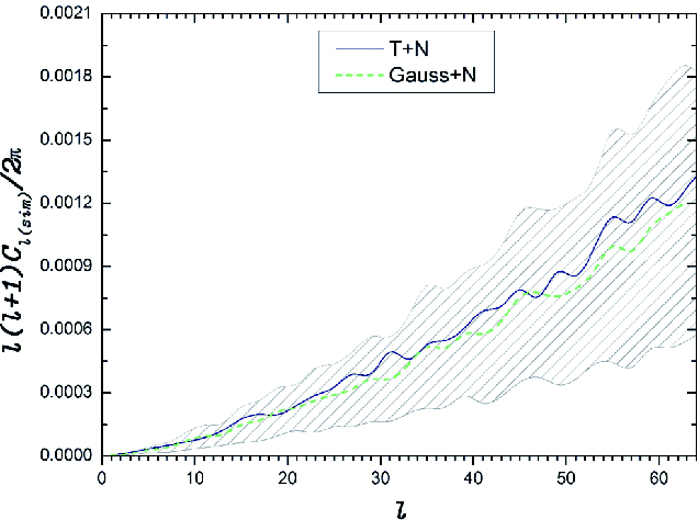Figure 3: The Kolmogorov power spectra for simulated CMB temperature (T+N) and Gaussian (G+N) maps with superimposed WMAP's noise, averaged over 190 cross-power spectra each; the smoothed error bars are shown. |