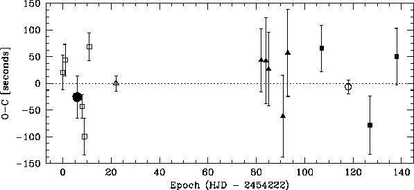 | Figure 4: The observed minus calculated time-of-transit diagram for the different timing values in the literature, as a function of the observed epoch for XO-1b. For clarity the diagram was divided in two different scale panels (minutes in the left panel, and seconds in the right panel). Different symbols represents different literature sources. The pentagons are from Wilson et al. (2006). The squares are the values from Holman et al. (2006). The open triangle is the value from McCullough et al. (2006). Our timing values are shown with solid triangles. All measurements are listed in Table 4. |