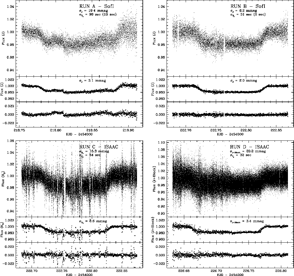 The final light curves are shown in Fig. 3, with a 20 s bin width version to easily show the best fitting model. Run A shows some systematic effects that could not be corrected, so this curve was only used to obtain timing values, and not planetary parameters.