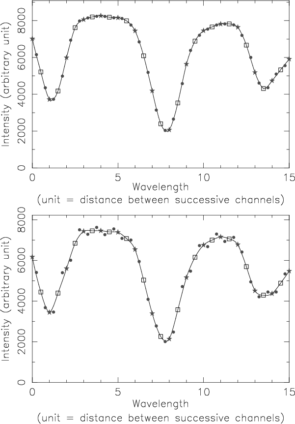 Fortunately, it is possible to combine successive 2D multi-wavelength images with a ``wide-band image'', which can be deduced for example from the sum of all MSDP channels. A first reduction method, already used for circular polarimetry (Malherbe et al. 2004), consists in destretching by Local Correlation Tracking. Other more sophisticated ones, often used for filtergrams and based on speckle reconstructions (Keller et al. 1992; Bello Gonzalez et al. 2008; van Noort et al. 2008), can restore multi-wavelength intensity images across the line profile, before inversion. Let us note again that, while filtergrams of different wavelengths are generally obtained at different times, MSDP images of different wavelengths are simultaneous and not sensitive to differential seeing effects. Of course, fast CCD cameras are required to perform such observations.