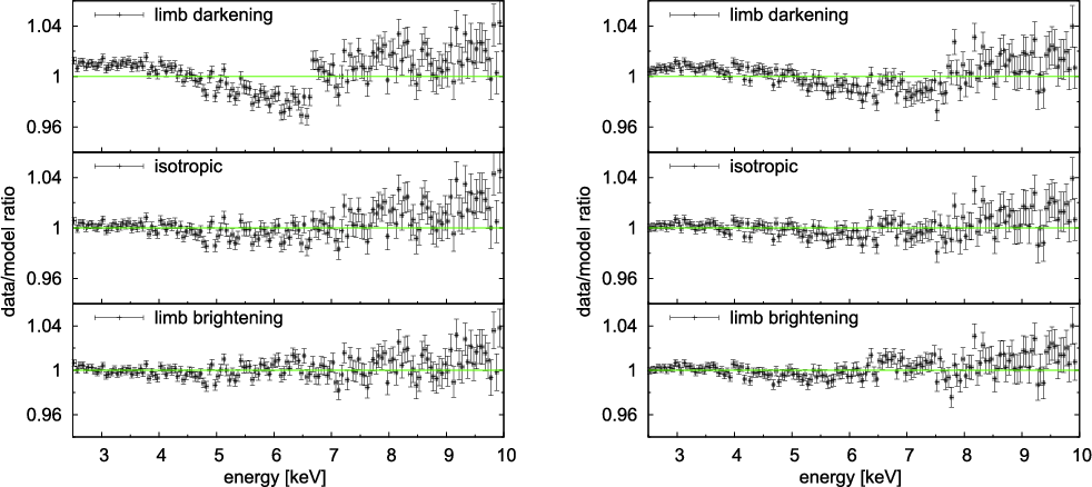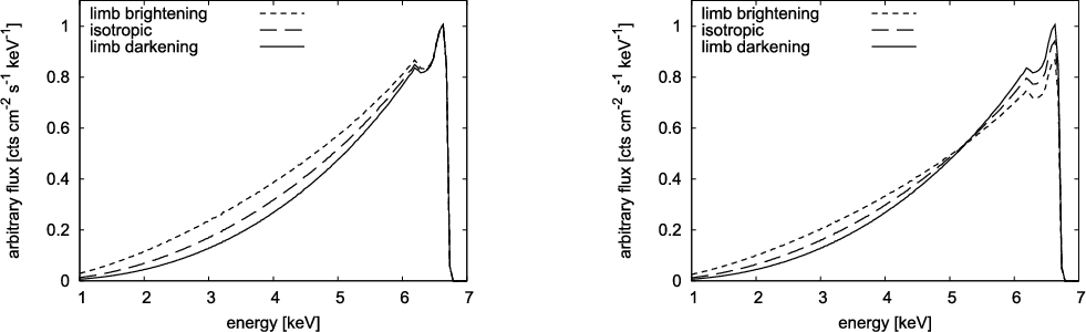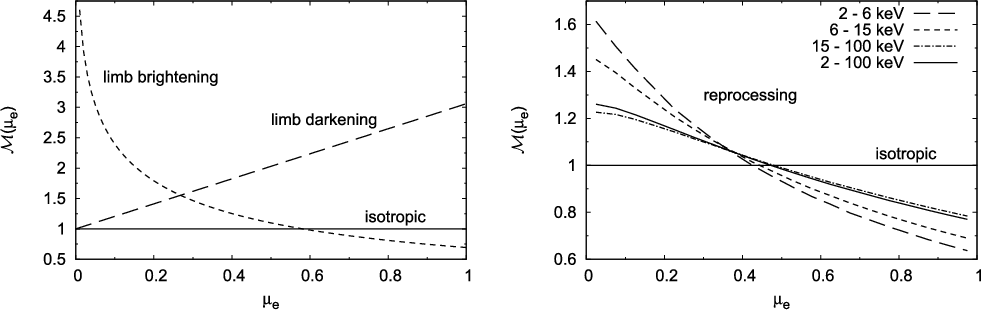 There is now strong evidence suggesting that the radiation of active galactic nuclei as well as some compact binary stars in the Galaxy originates in part from the gas of an accretion disc orbiting around a central black hole (Rees 1998; Kato et al. 1998). A great deal of information about these objects has been obtained via X-rays (Krolik 1999; Peterson 1997). Therefore, reliable models are needed to describe production of high-energy photons emerging from the accretion disc surface and subsequent propagation of these photons towards a distant observer.Directional distribution of the outgoing radiation is among the important aspects that must be addressed. Limb darkening traditionally refers to the gradual diminution of intensity in the image of the surface of a star as one moves from the centre of the image to the edge. It is a consequence of uneven angular distribution of the radiation flux emerging from the stellar surface (Mihalas 1978; Chandrasekhar 1960). Limb darkening results as a combination of two effects: (i) the density of the surface layers decreases in the outward direction; and (ii) temperature also drops as the distance from the centre of the star increases. The outgoing radiance is therefore distributed in a non-uniform manner. The actual form of the angular distribution depends on the physical mechanism responsible for the emission and the geometrical proportions of the source. The limb darkening law is widely applied also to describe radiation coming from an accretion disc around a black hole. In this case, relativistic effects can significantly enhance the observed anisotropy by bending the light rays and boosting the photon energy in the direction of motion of the emitter. As a result of this interplay between local physics of light emission and the global effects of the gravitational field, different processes contribute to the final (observed) directional anisotropy of the emission.