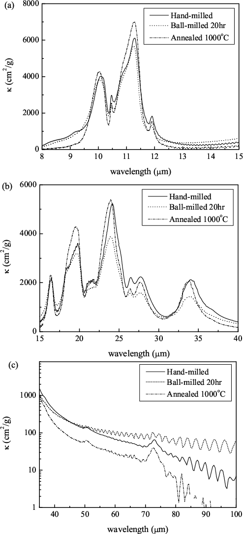 In recent years, a considerable number of studies have been conducted on the dependencies of the intrinsic properties. So far, effects of chemical composition and temperature on infrared absorption spectra of silicates have been investigated experimentally. For example, Jäger et al. (1998) reported the peak shift of the spectra of four olivine samples depending on the composition change from Mg to Fe end members. Chihara et al. (2002) and Koike et al. (2003) clarified the compositional dependency of pyroxene and olivine IR spectra. Bowey et al. (2001) measured the temperature effects on IR spectra of olivine and pyroxene. Koike et al. (2006) revealed the temperature dependence of IR spectra of olivine, and estimated temperatures in circumstellar environments. Fabian et al. (2000) and Murata et al. (2007) reported the evolution of IR spectra by crystallization of amorphous silicates.