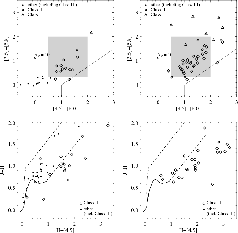 Young stars undergo various phases on their way to the main-sequence. Their different evolutionary stages are recognized by specific observational features, such as excess emission over the expectation for a stellar photosphere that arises from circumstellar matter. Initially, Young Stellar Objects (YSOs) are embedded in envelopes of cold and dusty material that emit prominently at infrared (IR) and sub-millimeter wavelengths. The youngest, protostellar phases are termed Class 0 and Class I in a classification scheme based on the spectral energy distribution (SED) (Lada 1987). As their evolution proceeds, disk accretion and reprocessing of stellar light in the disk become the identifying feature and the YSO is of Class II. Finally, when all circumstellar matter has dispersed or accreted onto the star a Class III object is left that is unconspicuous at IR bands as its SED is purely photospheric.