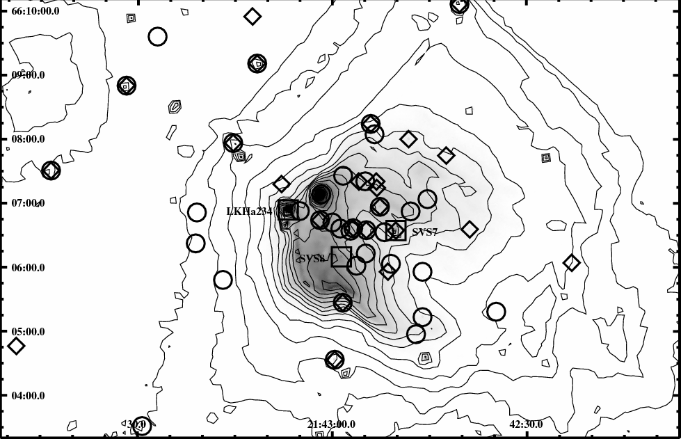Table 6: Candidate YSOs without X-ray emission selected on basis of their IR photometry. Asterisks in column ``YSO Class'' identify objects selected on basis of near-IR data.