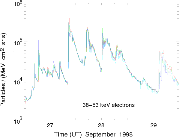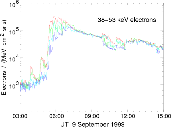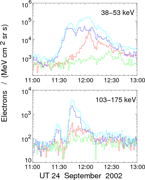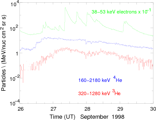 The clearest indication of coronal activity comes from the impulsive electron events, primarily because the observations are at 1 AU and the electrons cover this distance in tens of minutes, compared to hours for particles in the MeV/nuc region. Any nuclei emitted at the same time may not appear as discrete events at 1 AU but contribute to a generally enhanced background. However, sometimes the 3He has a favourable connection to the observer, leading to events such as those shown in Fig. 13.