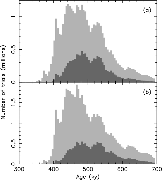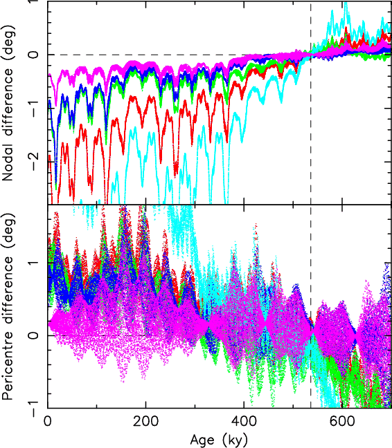 - Obviously, the two age determinations used different orbit sets and this might have influenced the results. However, if the new observations caused simple shrinking of the uncertainty ellipsoid in the space of initial orbital elements, we would expect to obtain equally nested solutions: the one with more accurate orbits would be entirely within the one with less accurate orbits. This idea assumes uniform mixing of results from the uncertainty ellipsoid, which is likely, but not entirely guaranteed.