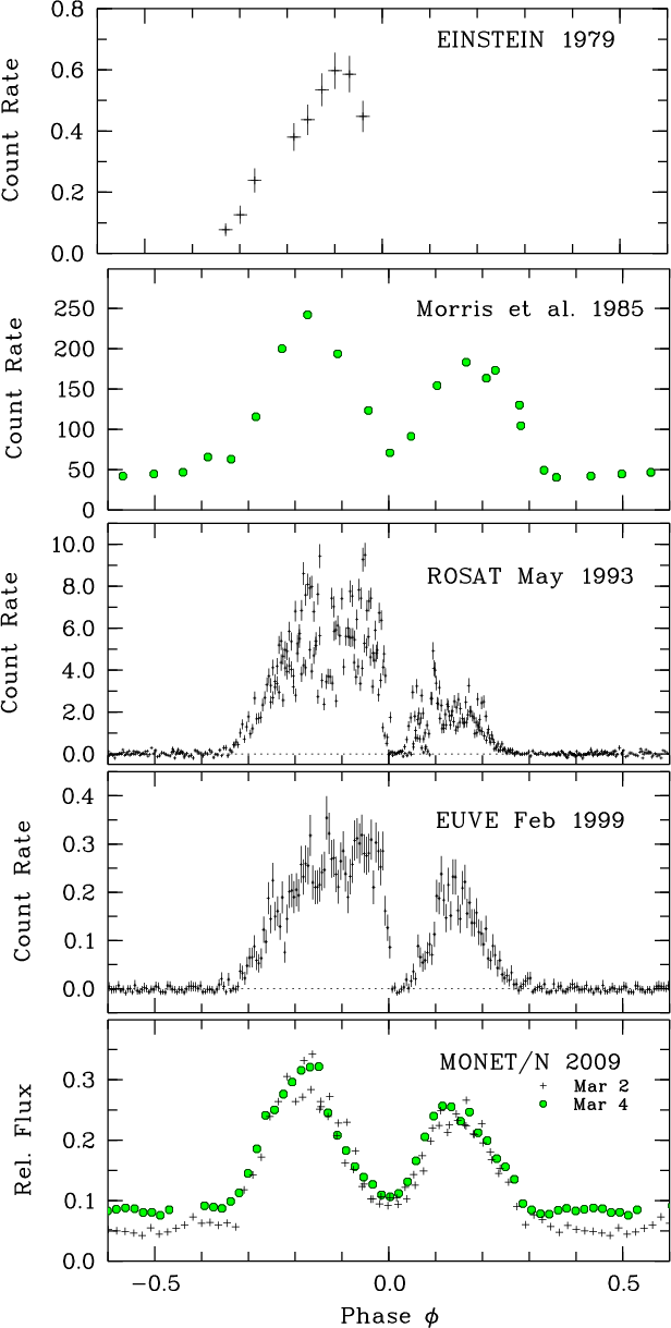 Figure 1: Phased light curves based on the optical ephemeris of Eq. (1). The Morris et al. (1987) and the MONET/N data were taken in white light. The ordinate for the latter is the flux of EK UMa relative to comparison star C1, and for all other panels, the ordinate is count rate in units of s-1. The two MONET/N light curves are for cycles E=0 and E = 24. |