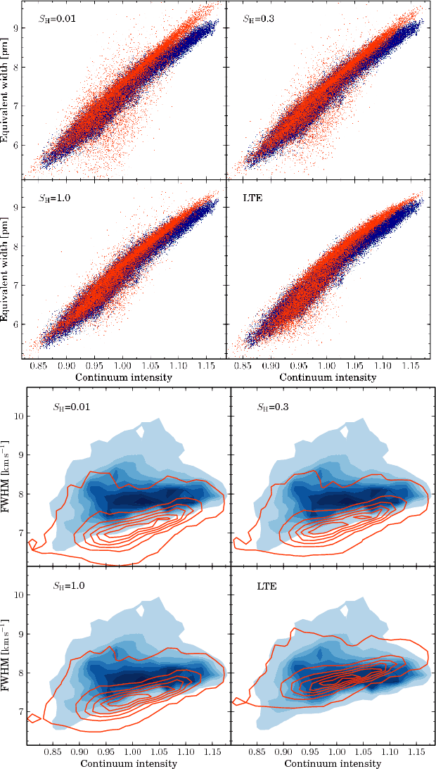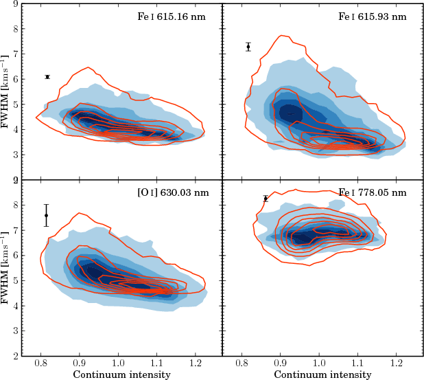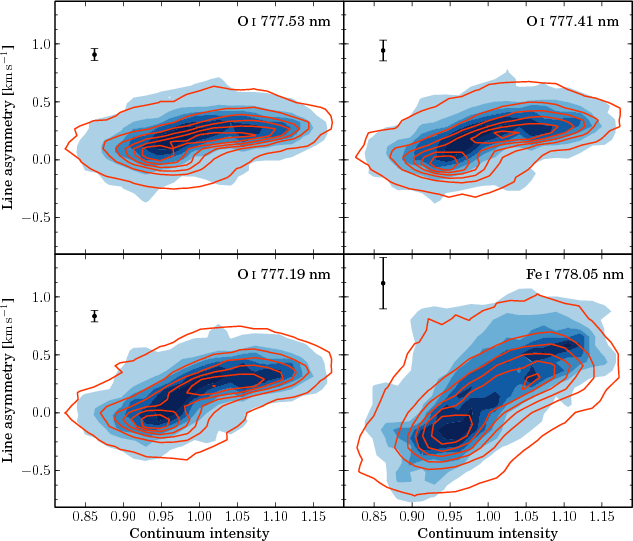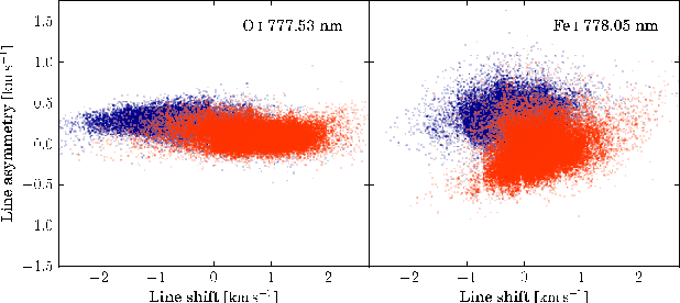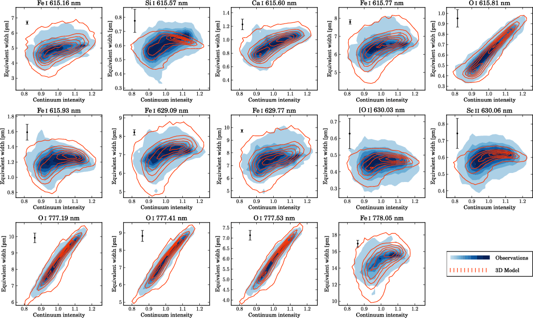 To study the line parameters we employ a similar methodology as Kiselman (1994). We study the variation of line strengths, shapes and shifts over the observed granulation and compare it with the 3D model. For the O I 777 nm triplet lines, known to suffer departures from LTE (e.g. Eriksson & Toft 1979; Fabbian et al. 2009; Asplund 2005), we seek to find whether the spatially-resolved disk-centre observations can constrain the NLTE line formation, as has previously been done using the centre-to-limb variations (Allende Prieto et al. 2004; Pereira2009a).