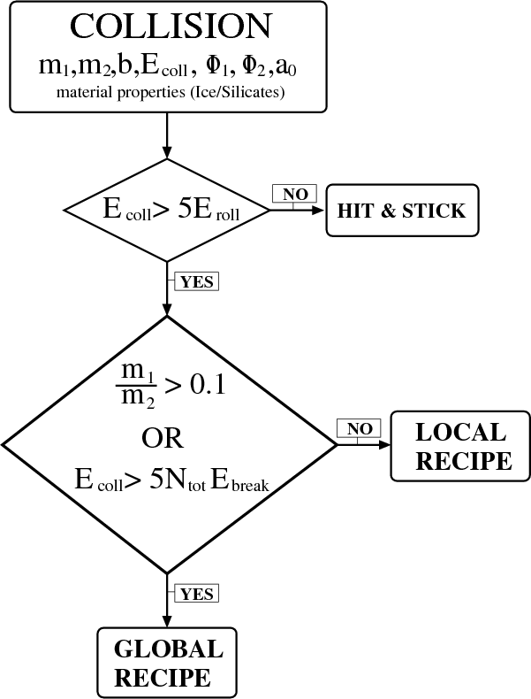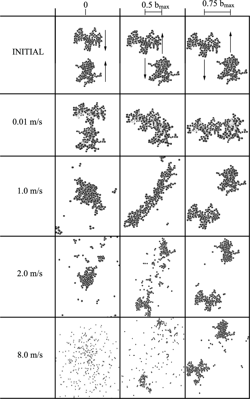 - In the case of erosion and shattering, the structure of small fragments can be written in a very simple form (see Eq. (14)), regardless of the initial compactness of colliding aggregates or the impact energy.