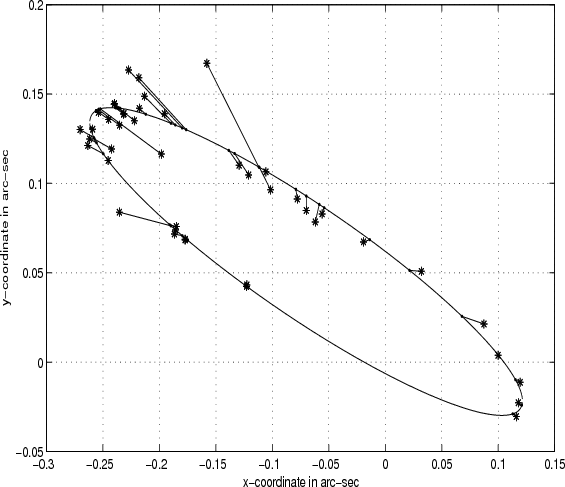 Späth (1997) proposes an algorithm to minimize the perpendicular distance between the data point and the fitted ellipse. This differs from SDP's use of a line segment from the center to the data point, which will only be perpendicular to the ellipse when the eccentricity becomes zero. His algorithm allows for error in both x and y, but is nonlinear, requires numerous iterations, and takes no account of the constant of radial velocity. (To be fair to Späth, he considers only the problem of fitting ellipses to data, not the calculation of the apparent orbit of a double star.)