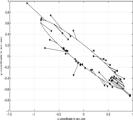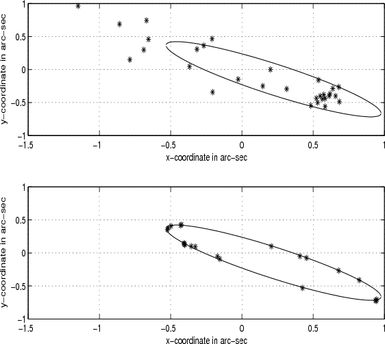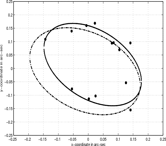 Both least squares solutions give an ellipse with a long semi-major axis, but significantly less eccentric than the SDP solution. The distribution of the observations about the ellipse is superior with the SDP solution, seven observations outside of the ellipse, six within. Least squares, on the other hand, gives four observations outside of the ellipse, nine within, despite what a runs test indicates for the randomness of the residuals. With thirteen observations we would expect 6 or 7 runs with a standard deviation of 1.8. Applied to the three solutions the runs test gives for OLS nine runs, for TLS seven runs, and for SDP six. The SDP runs agree well with what is observed in Fig. 6 but are far off the mark for the OLS runs. This, however, is a consequence of how we define the residuals. With SDP the residuals have a clear geometric interpretation whereas with least squares they arise from the solution of a linear system where the relationship between the fitted ellipse and the minimization criterion is highly convoluted. With OLS, for example, the residuals given by Eq. (6) bear no obvious relation to the ellipses shown in Fig. 5.