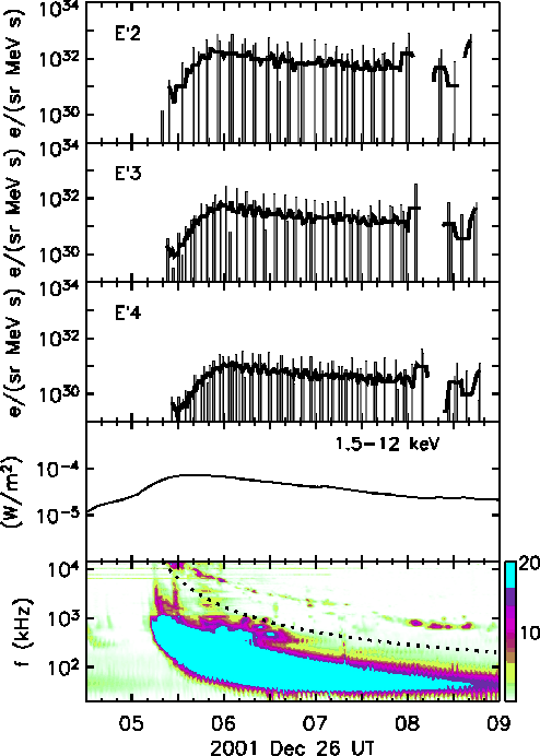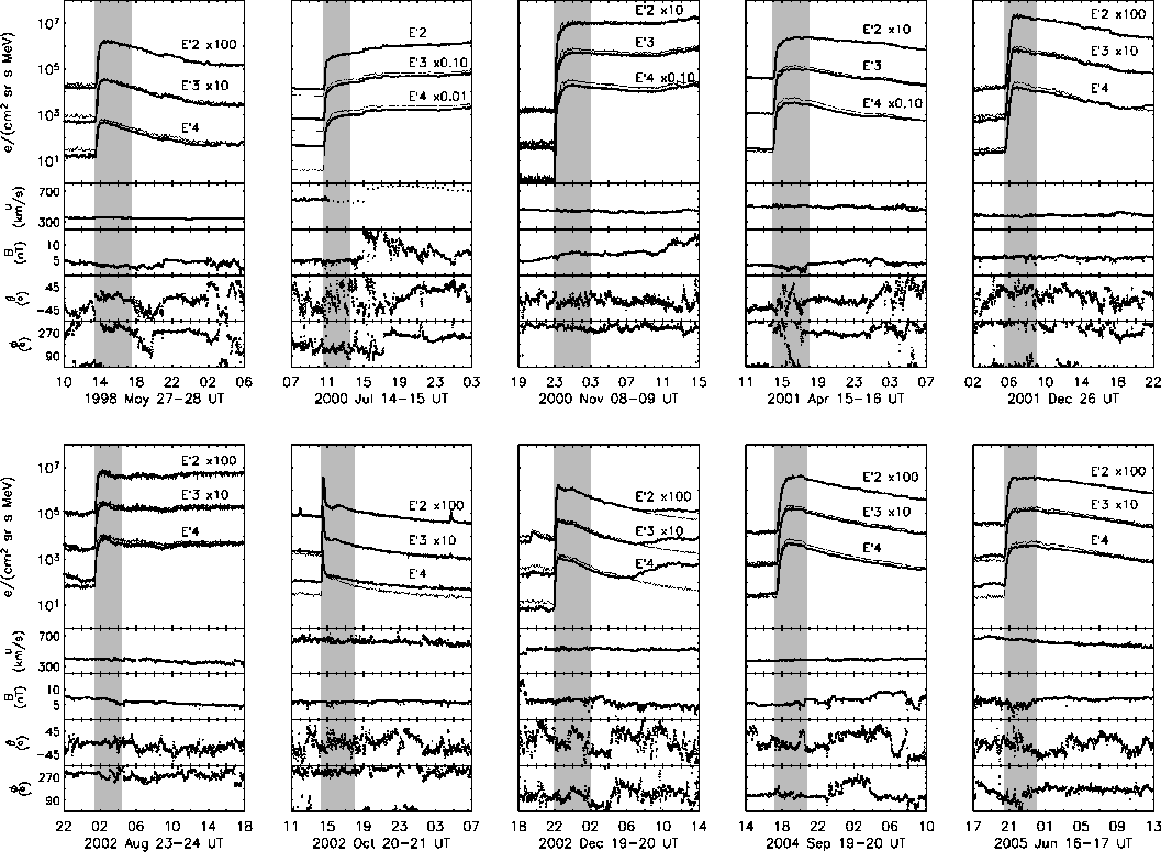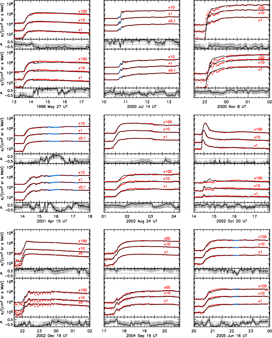 AcknowledgementsR.V. and N.A. are grateful for the financial support of the Academy of Finland (projects 110021 and 121650). Computational support has been provided by the Centre de Supercomputació de Catalunya (CESCA) and the Finnish IT center for science (CSC). D.L. was partially supported by NSF under SHINE research grant ATM-0648181 and by NASA under HGI grant NNX09AG30G. N.A. and B.S. acknowledge the financial support of the Ministerio de Ciencia y Tecnología (Spain), under the projects AYA2004-03022 and AYA2007-60724. We wish to thank the ACE/EPAM team for providing the electron sectored particle data.